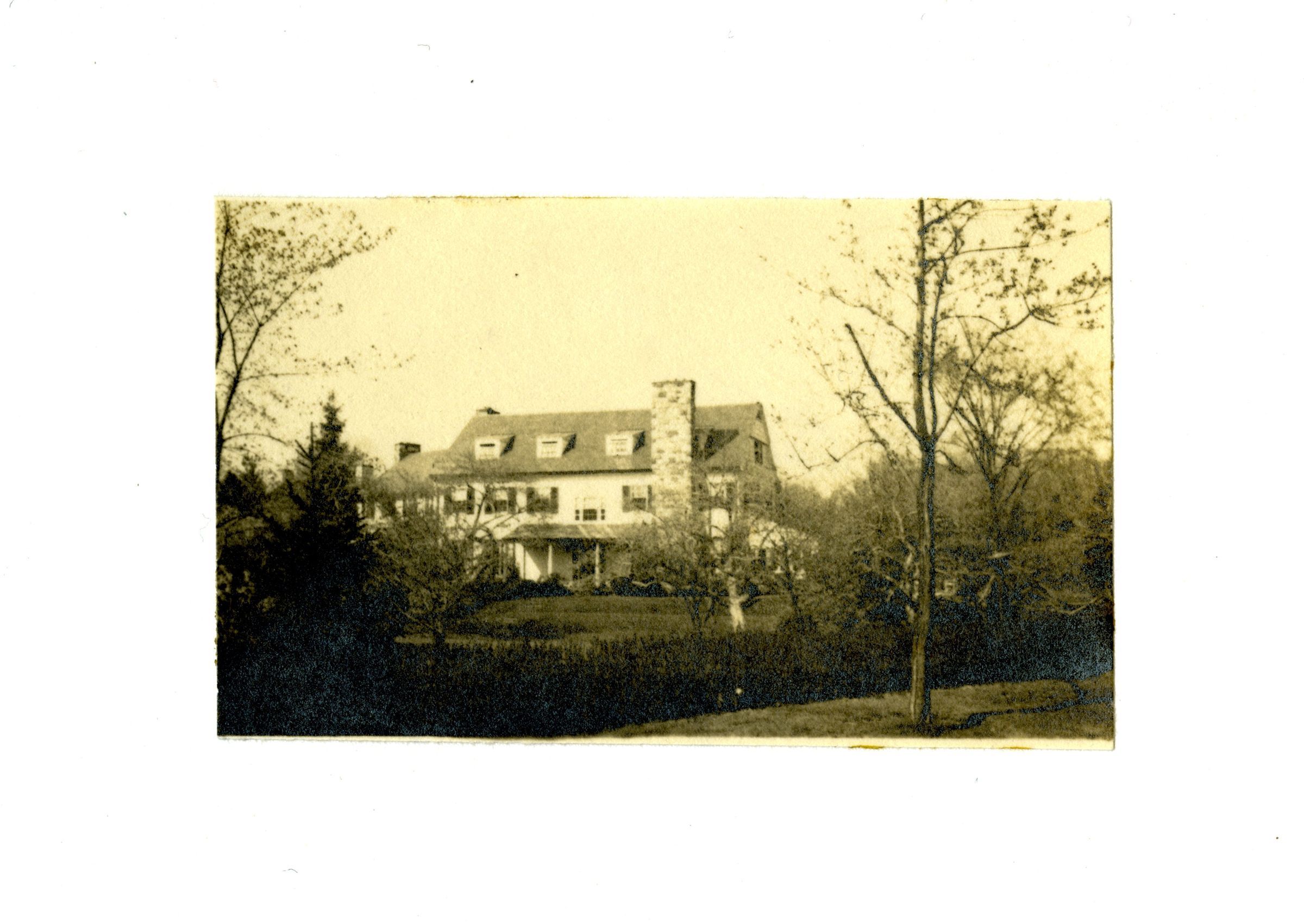 A three story house with a wide stone chimney and three, top-floor dormers.