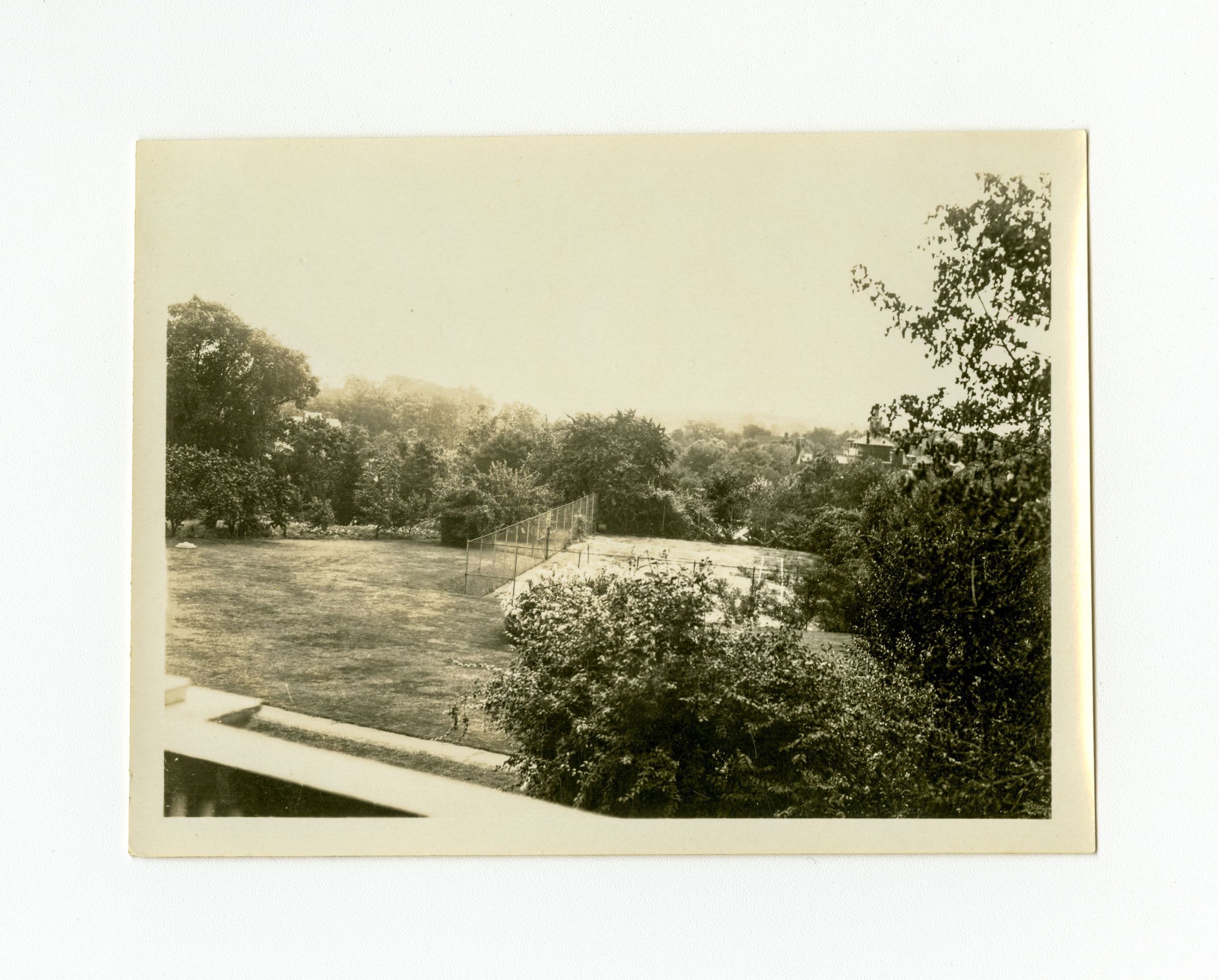Part of the estate's lawn with an area surrounded by chain-link fencing.
