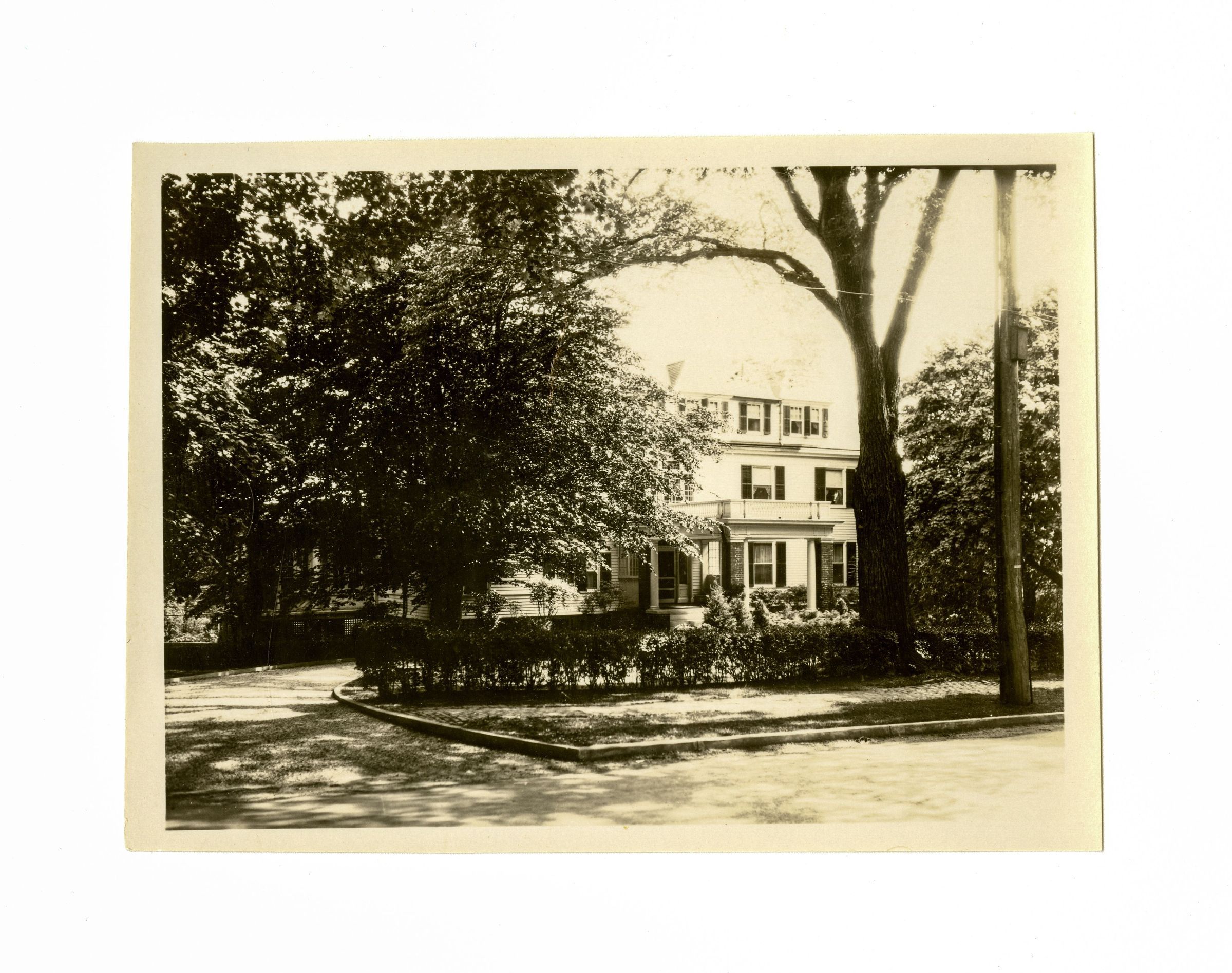 A view of three story house with a balcony that covers the front door and the driveway in front of the doorway..Collection
