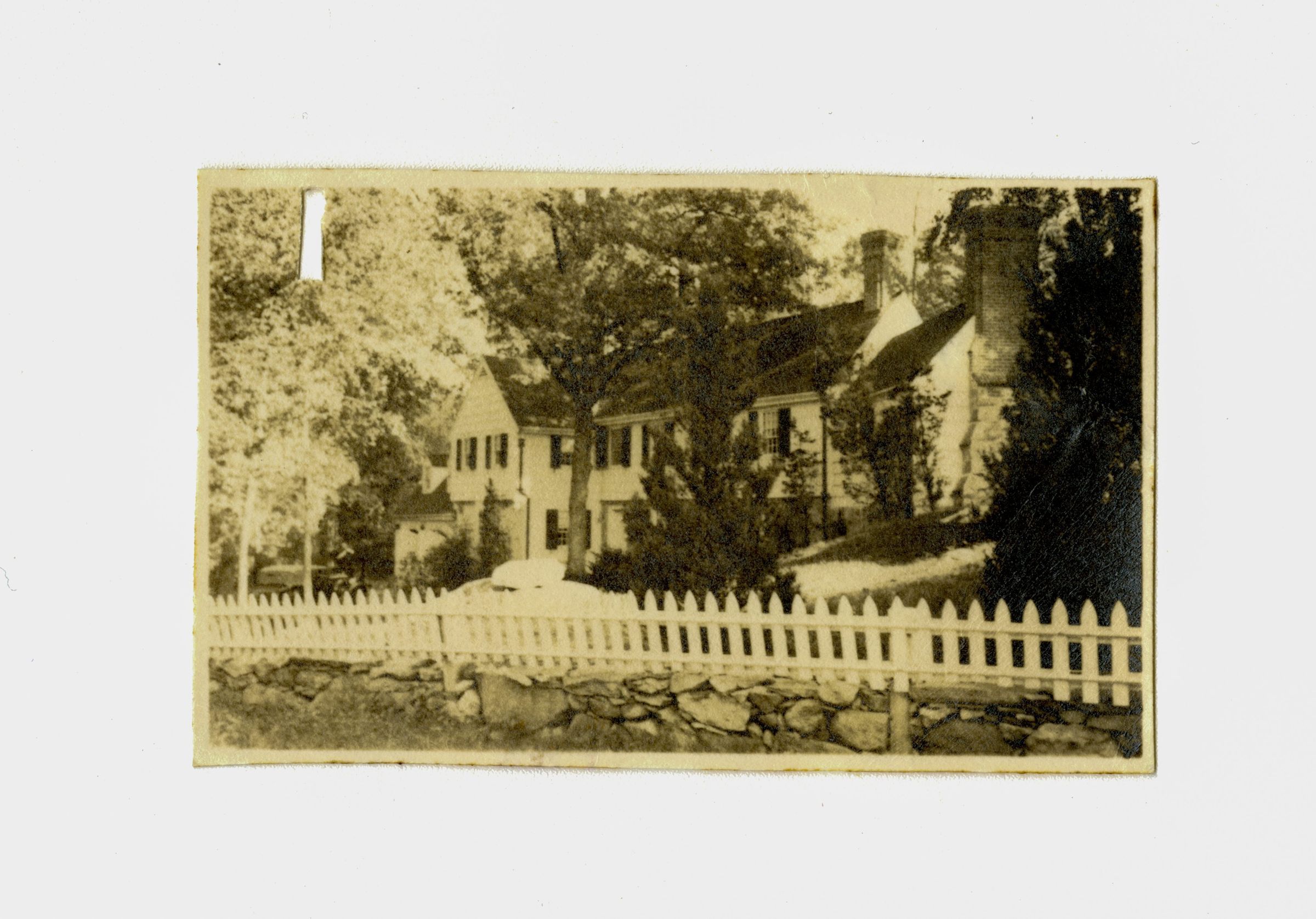 A two story house with a small picket fence on top of a stone wall in the foreground.Collection
