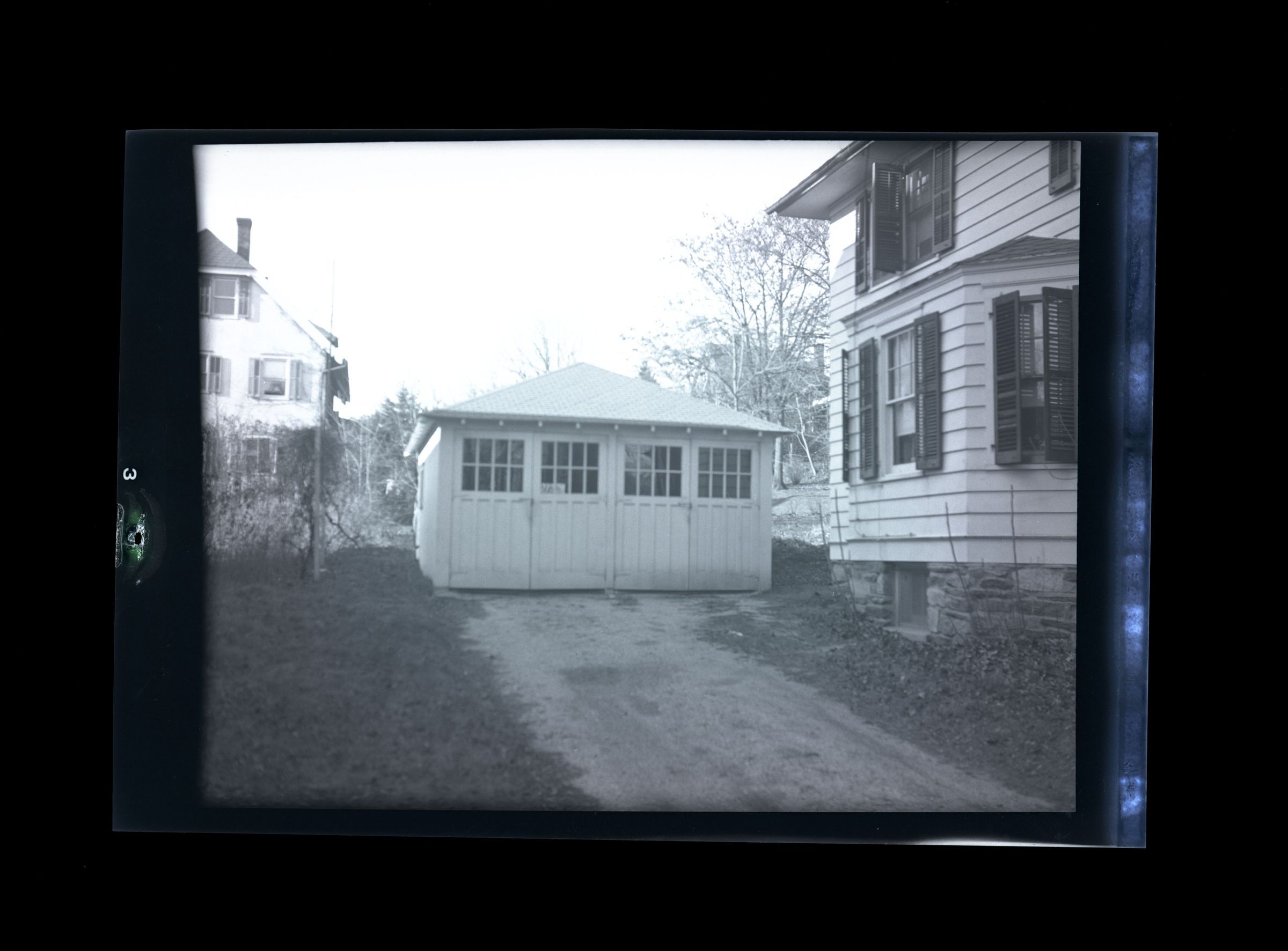 A two door garage at the end of a driveway with the side of the house on the right of the image.Collection