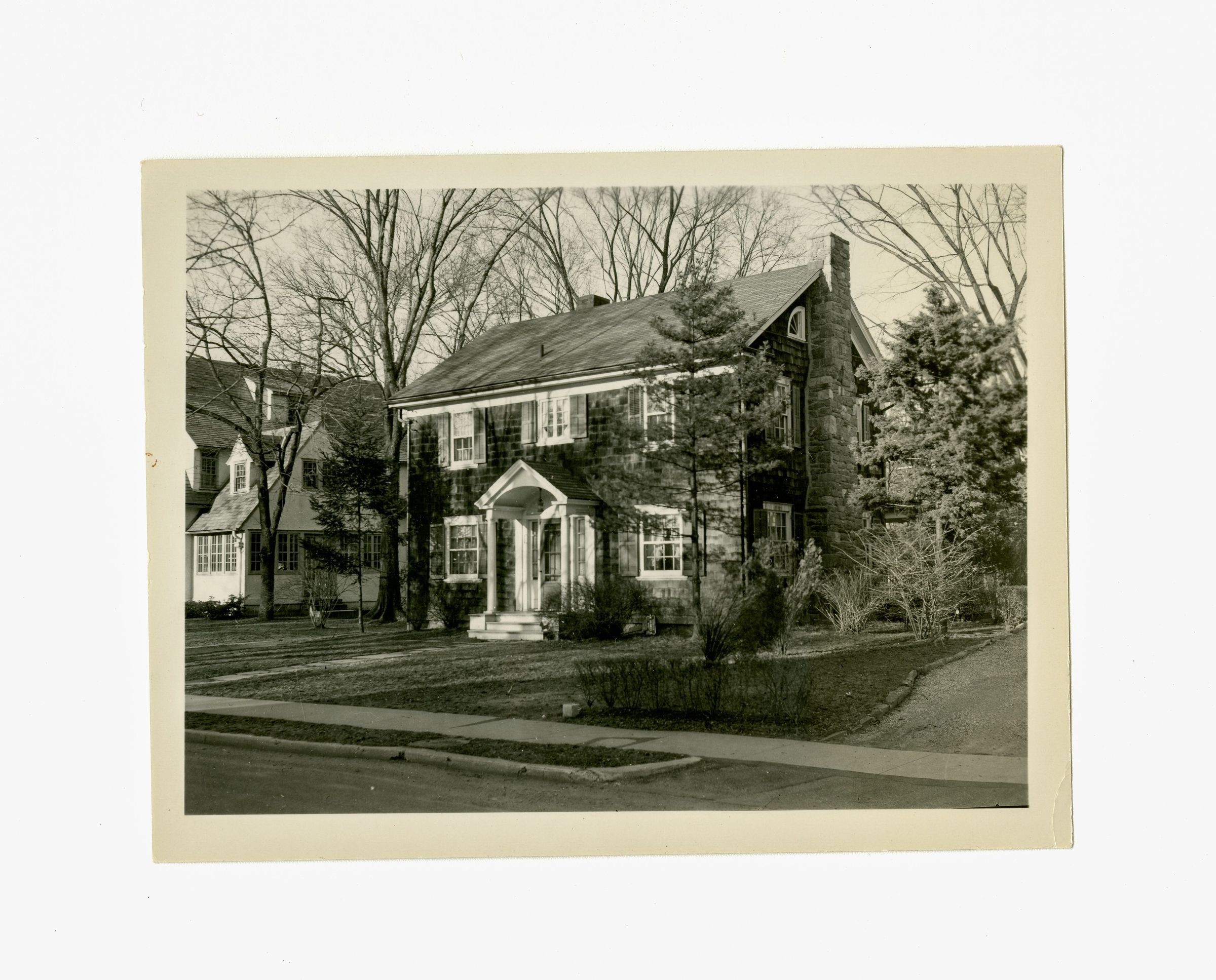 A three story shingle home with small portico over the front door and a stone chimney.Collection