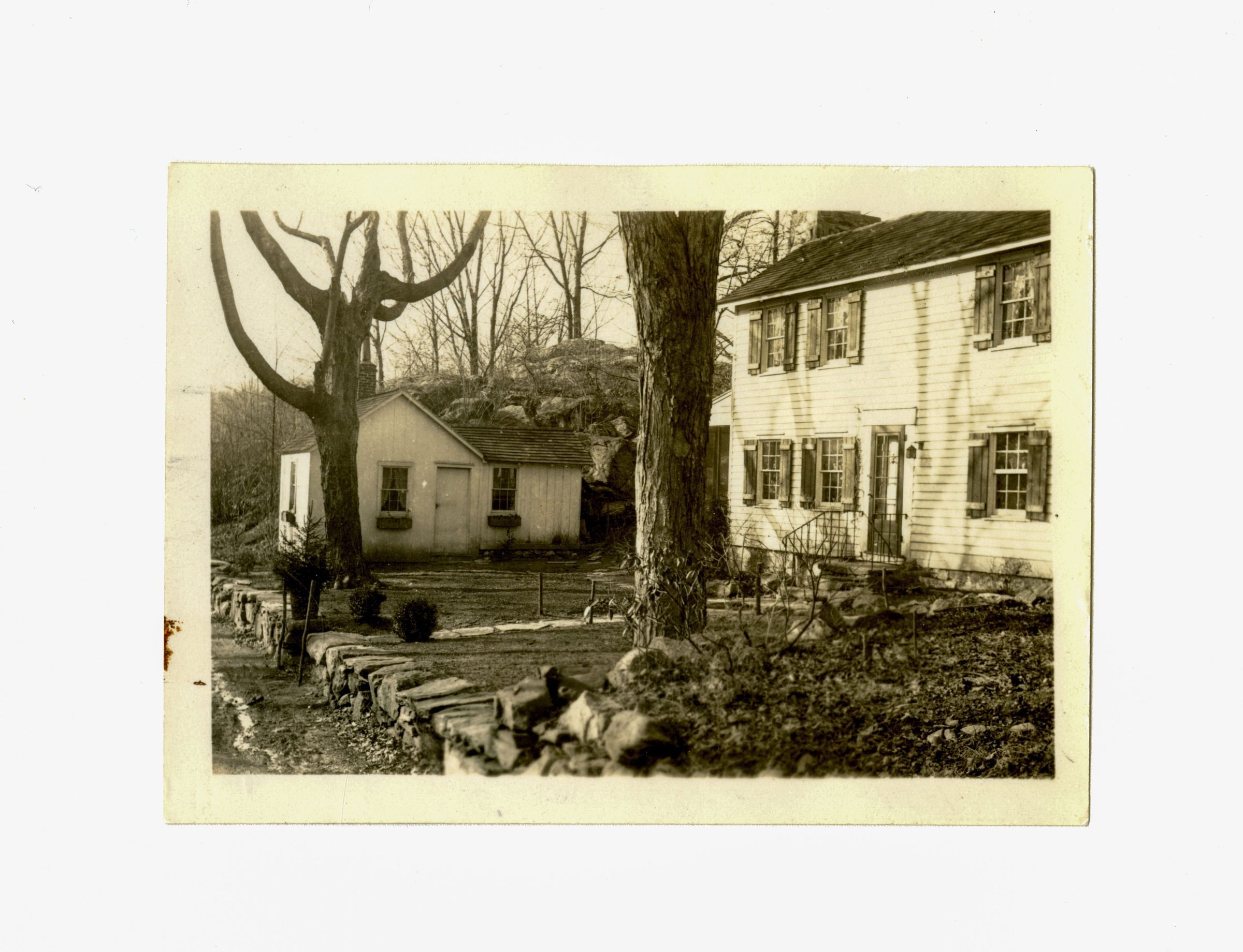 A view of the front of a two story clapboard house, its front lawn, and a small cottage/out building at the end of the lawn.Collection