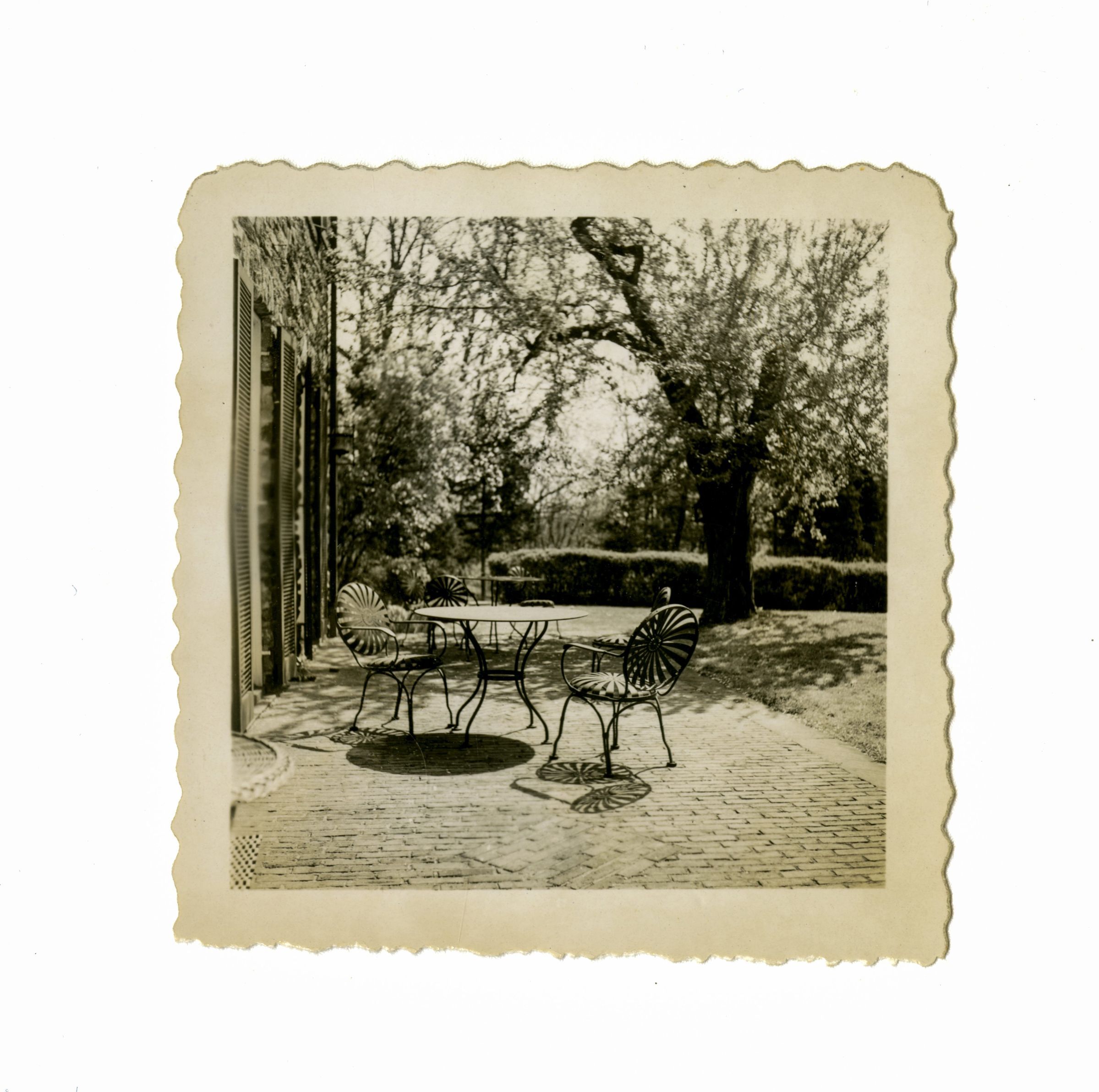 An outdoor table and chairs on the patio with a flowering tree in the background.Collection