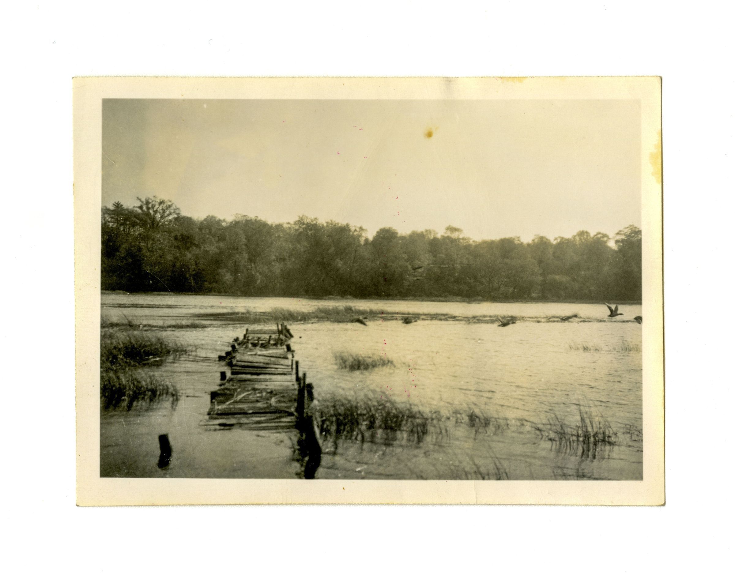 A view looking across the Mianus River with a dilapidated dock and flying ducks in the center of the image.Collection