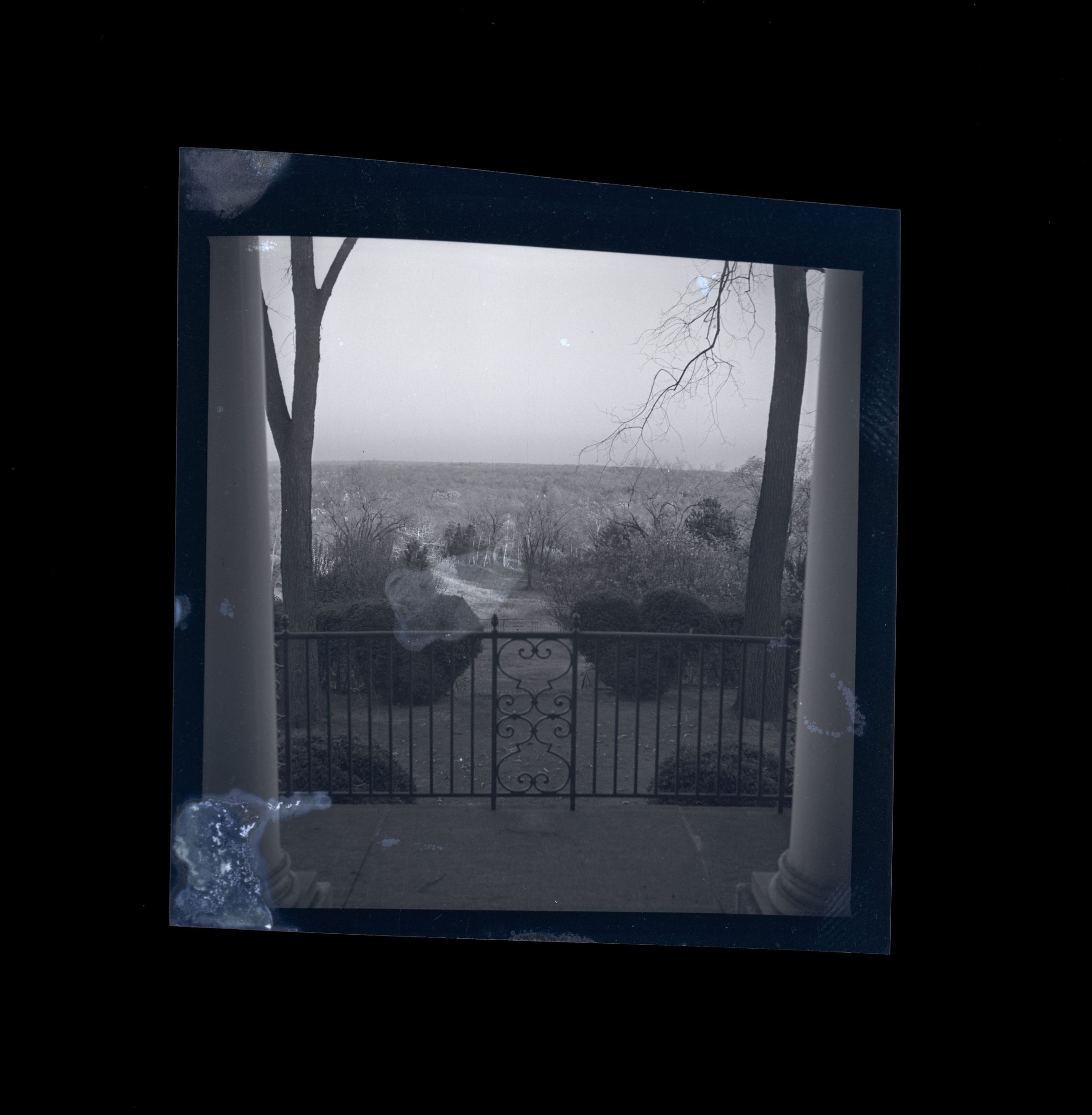 A view from a balcony looking out towards wooded area with some details of other houses visible.Collection