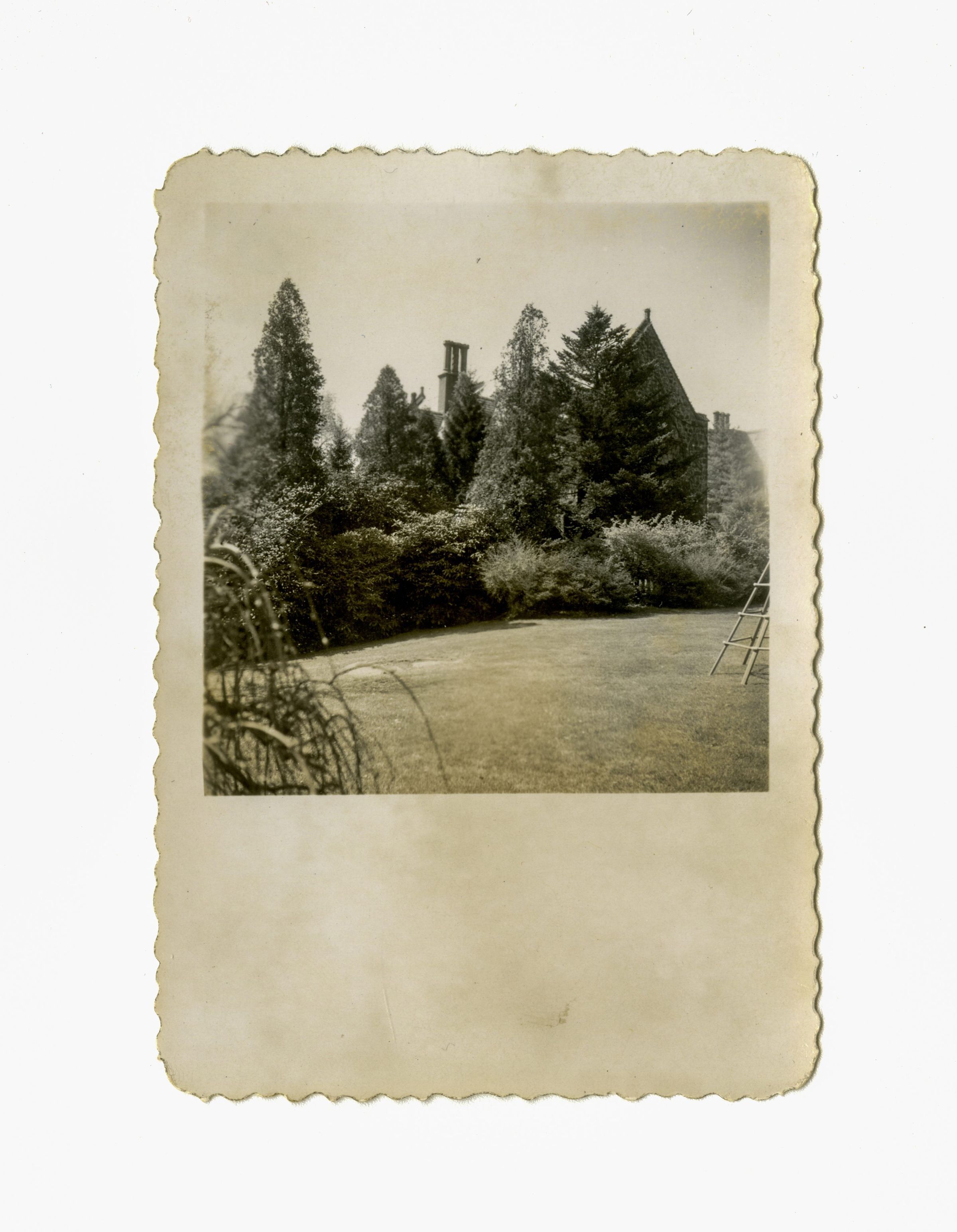 A number of trees in the garden with the roofline and chimney of the house visible in the background.Collection