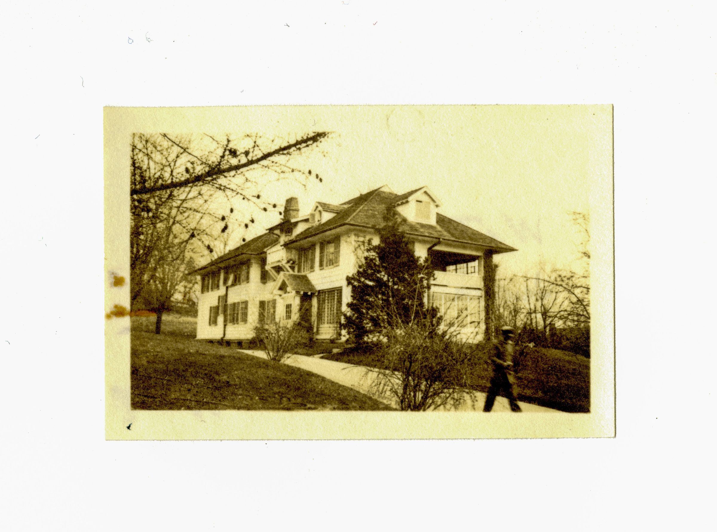 A three story home with dormer windows and a man walking on the road to the front door.Collection