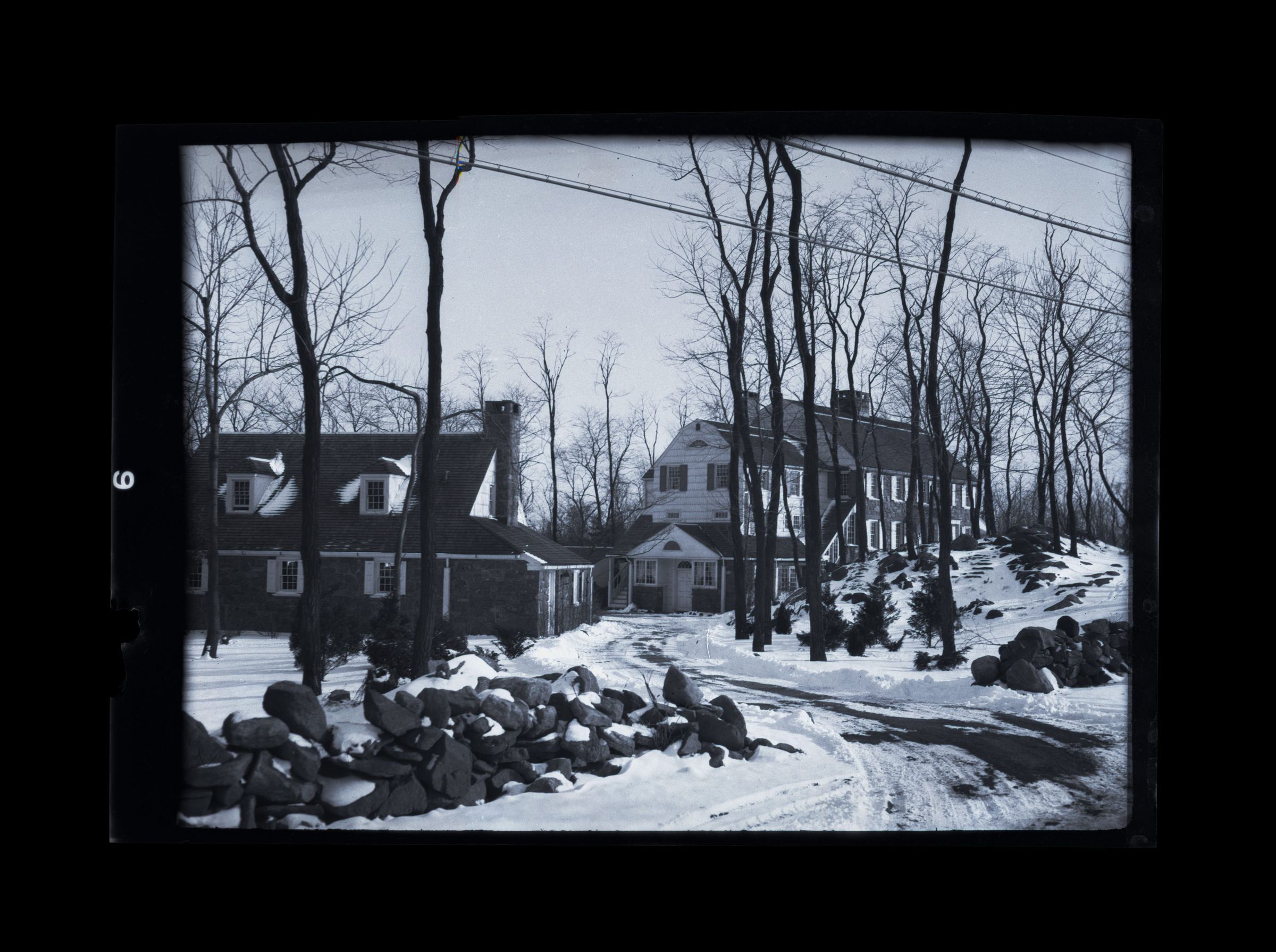 Two stone and clapboard houses and the snow covered driveway they share.Collection