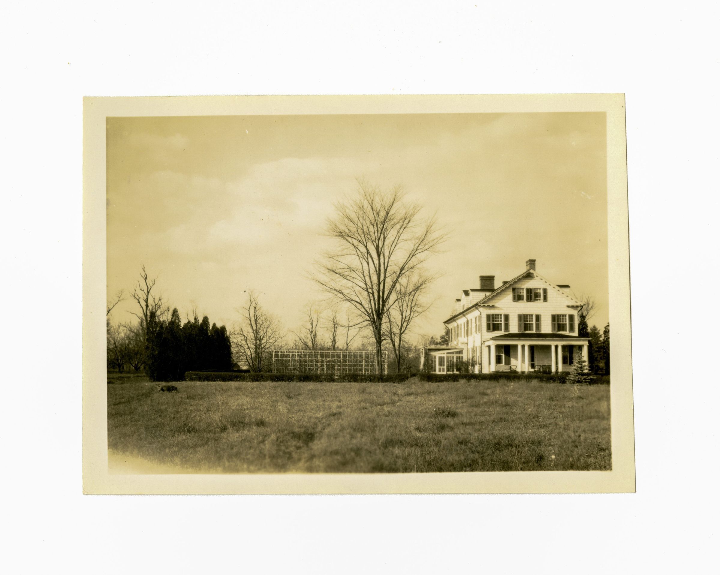 The side view of three story home and its garden trellis viewed from a field by the house.Collection