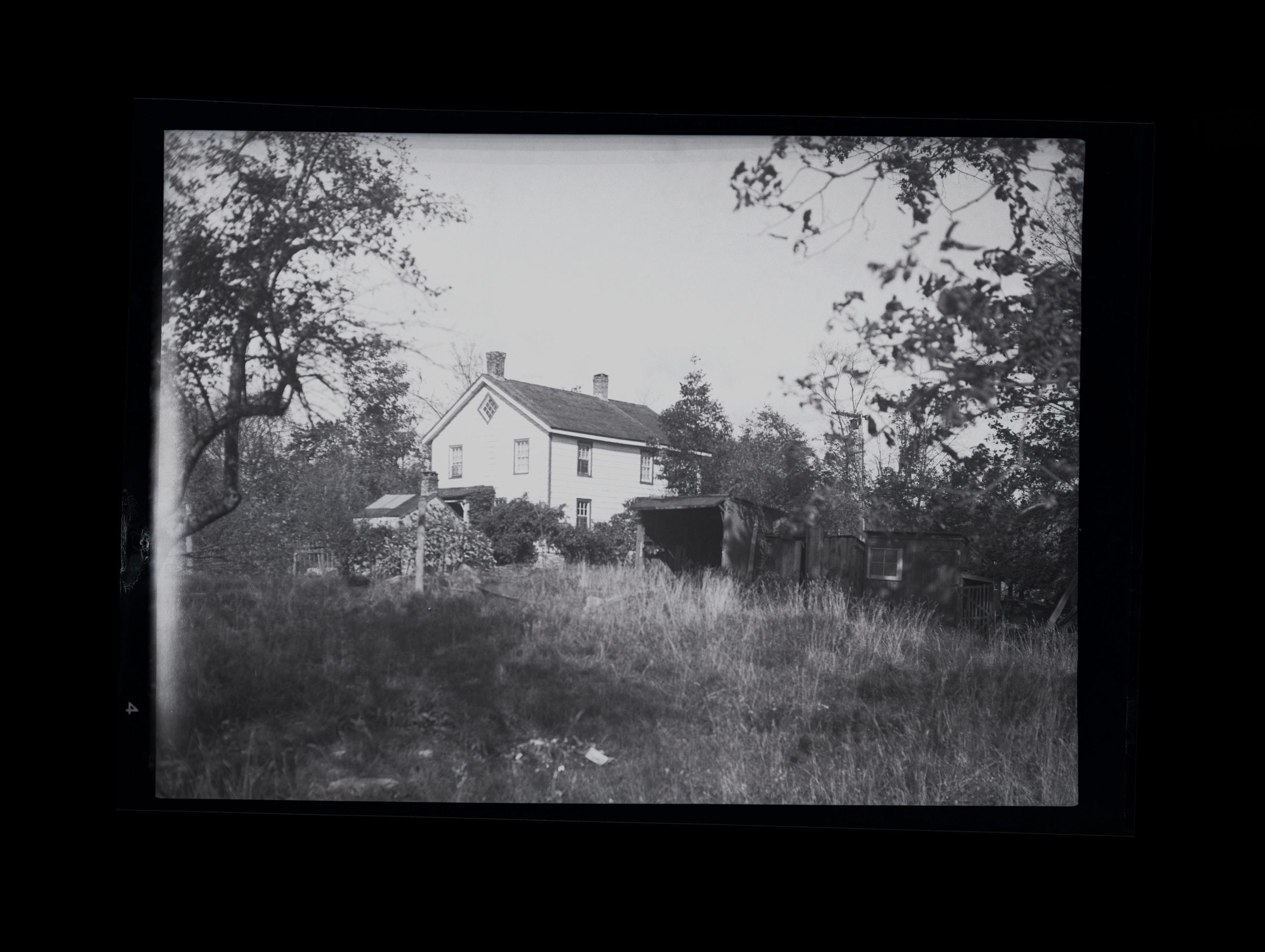A three story house with several small sheds/outbuildings in the midground of the image.Collection