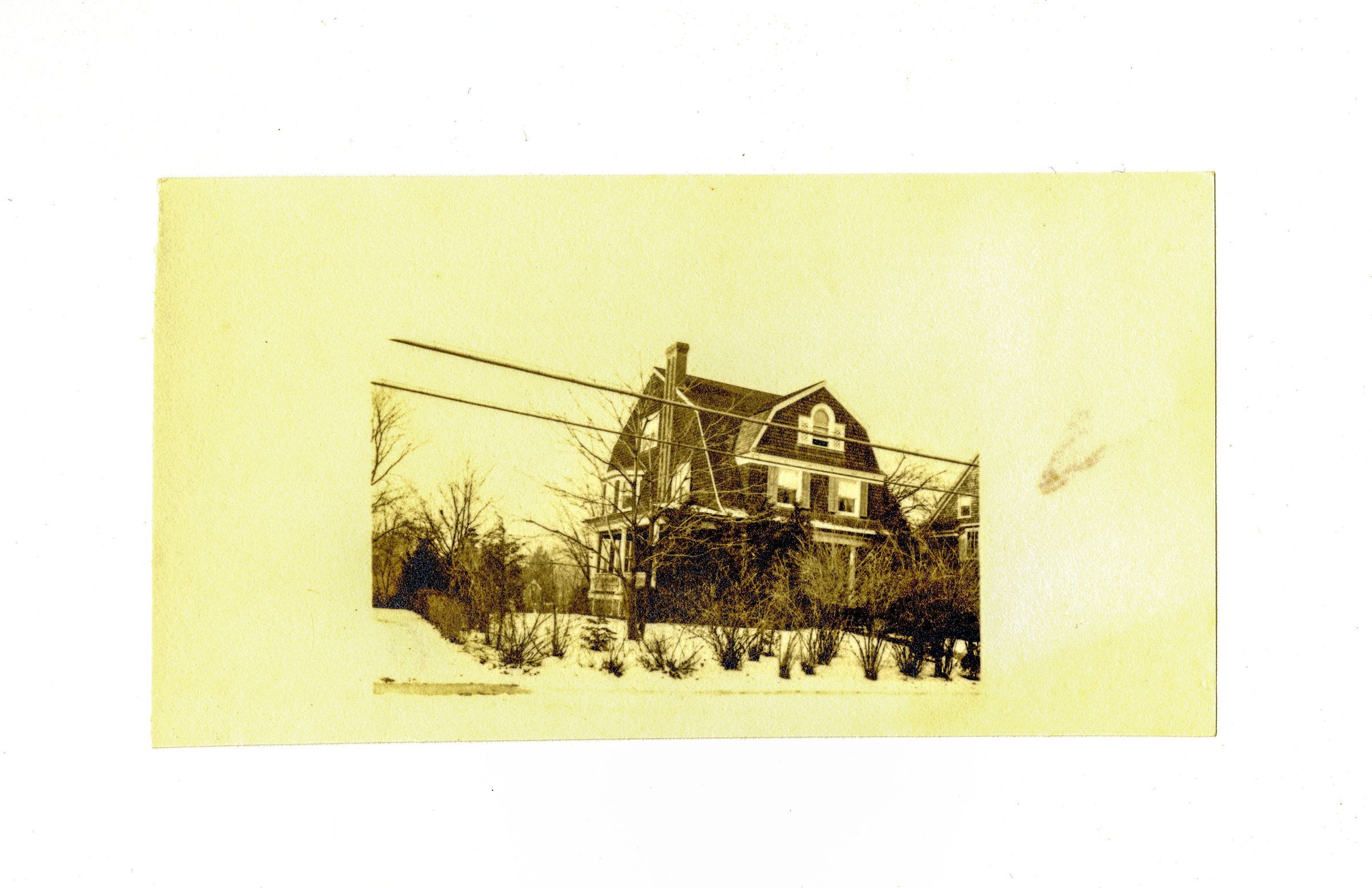 A three story shingle house with a gambrel-style roof.