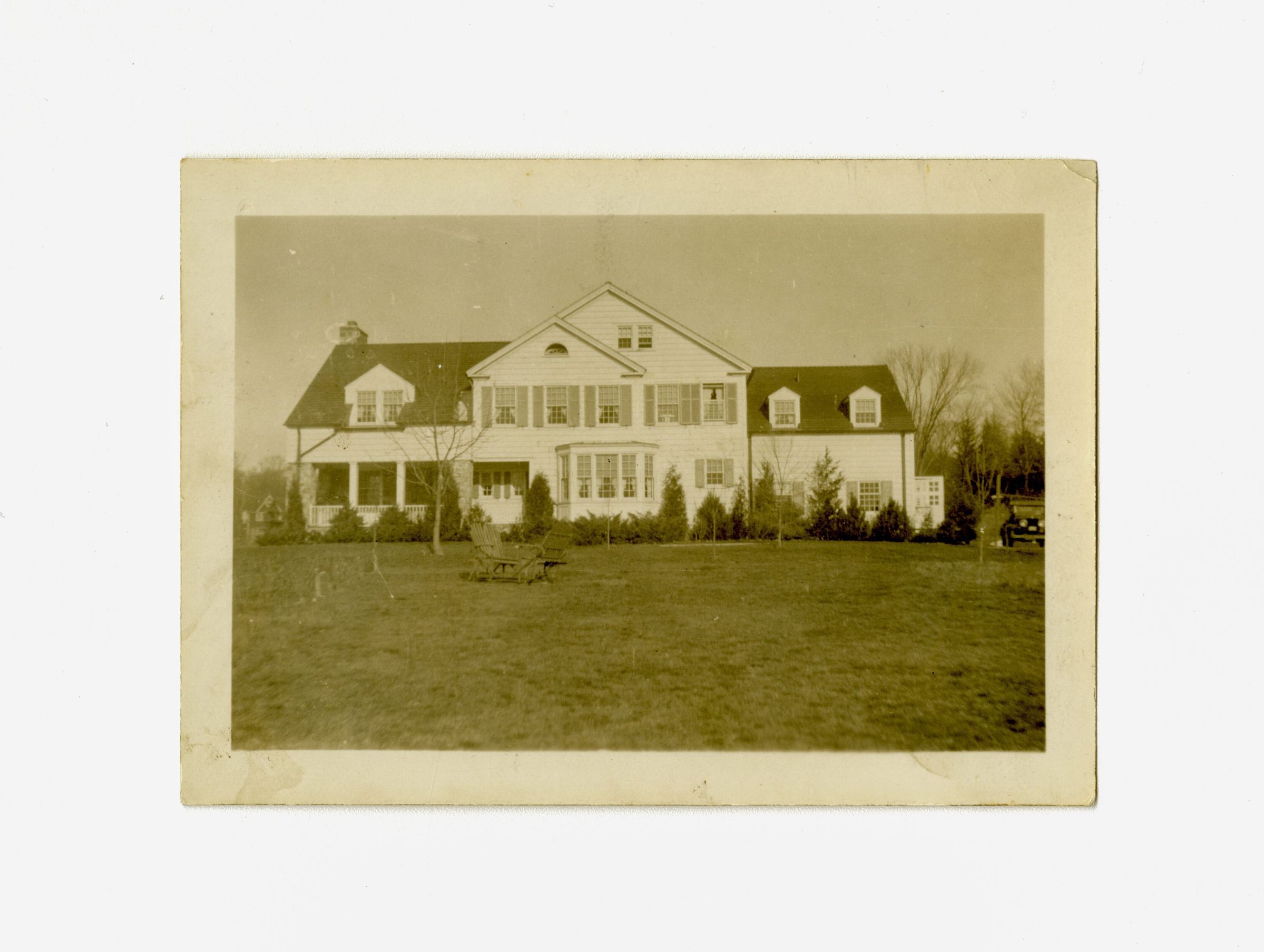 A large, three story house and part of its lawn with a car parked on the right of the image.Collection