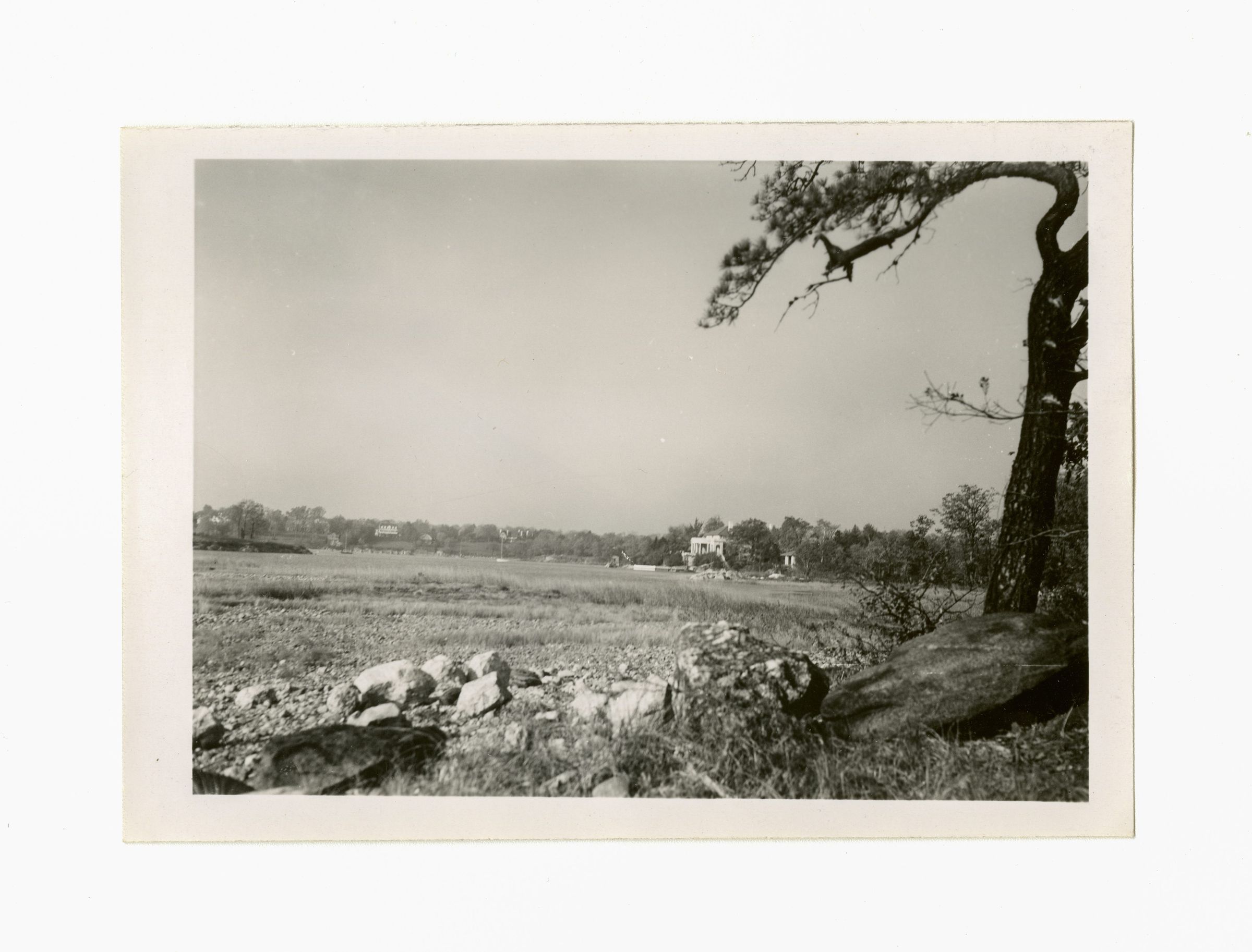 An image looking over a tidal, saltmarsh area with a house in the background.