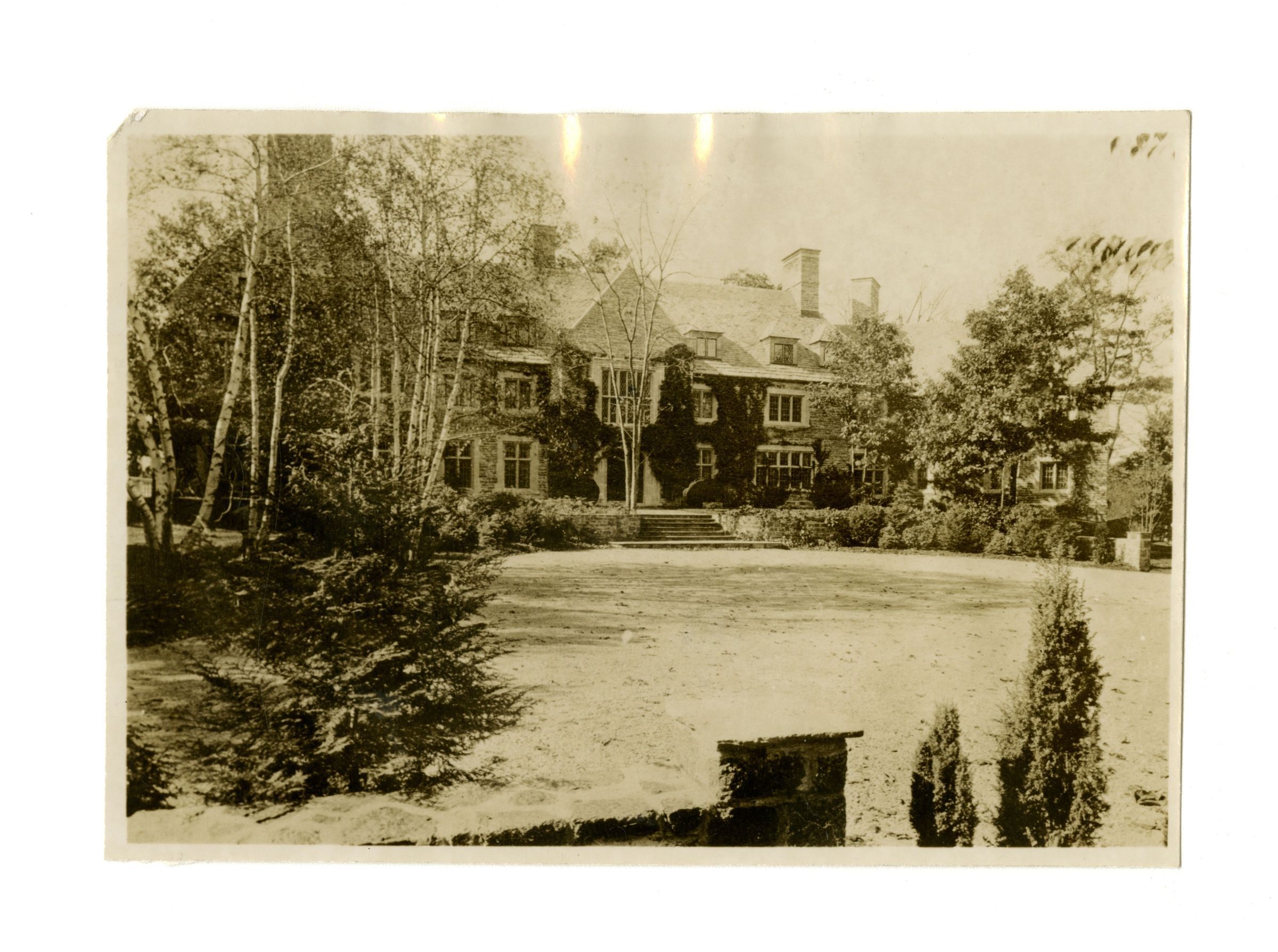 A view from a semicircular, tree-and-bush lined lawn of a stone house.Collection