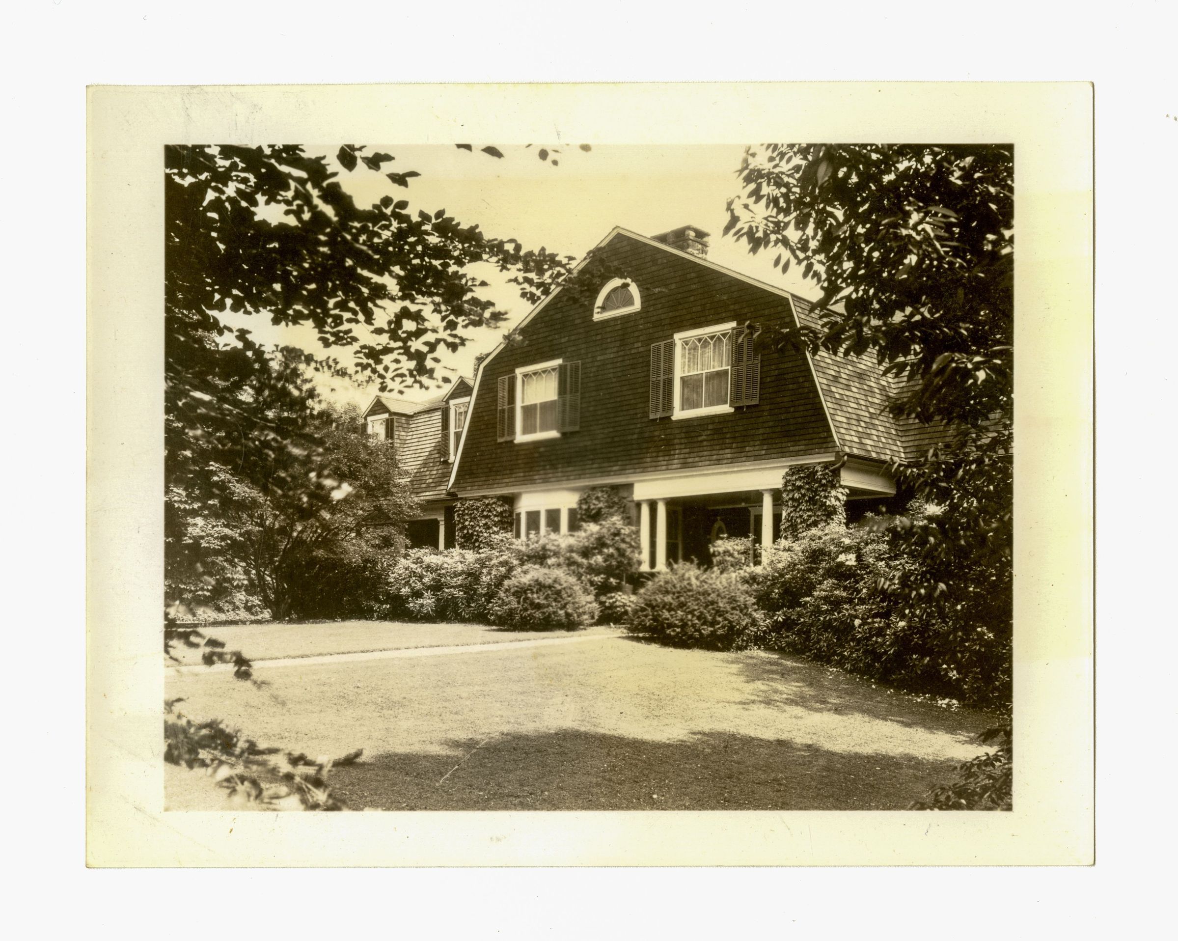 A three story shingle house with a gambrel-style roof and part of its lawn.
