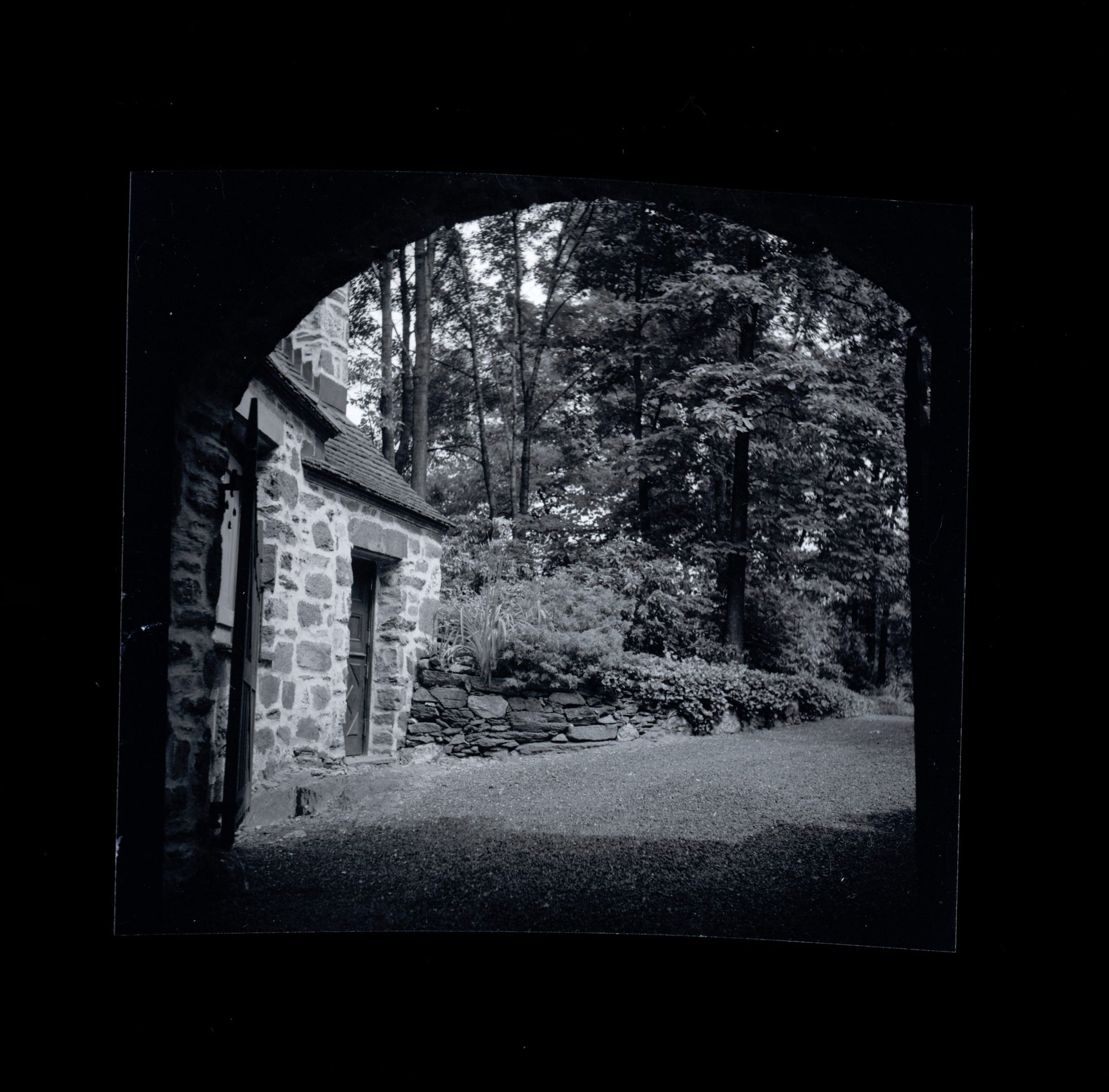 A view from under an arch of part of a stone house and part of its grounds.Collection