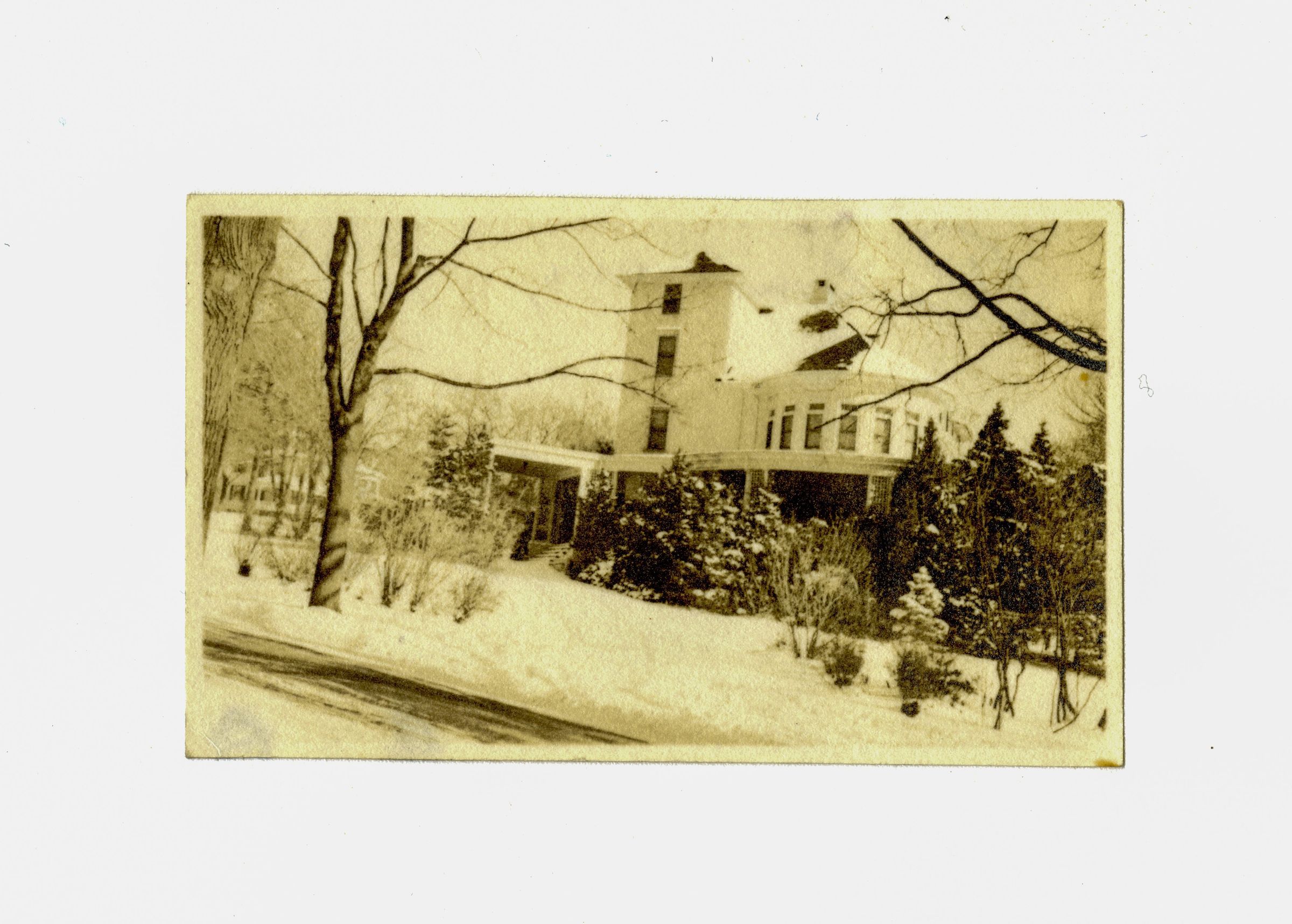 A four story house with a 'tower' and a second floor circular room in the snow.