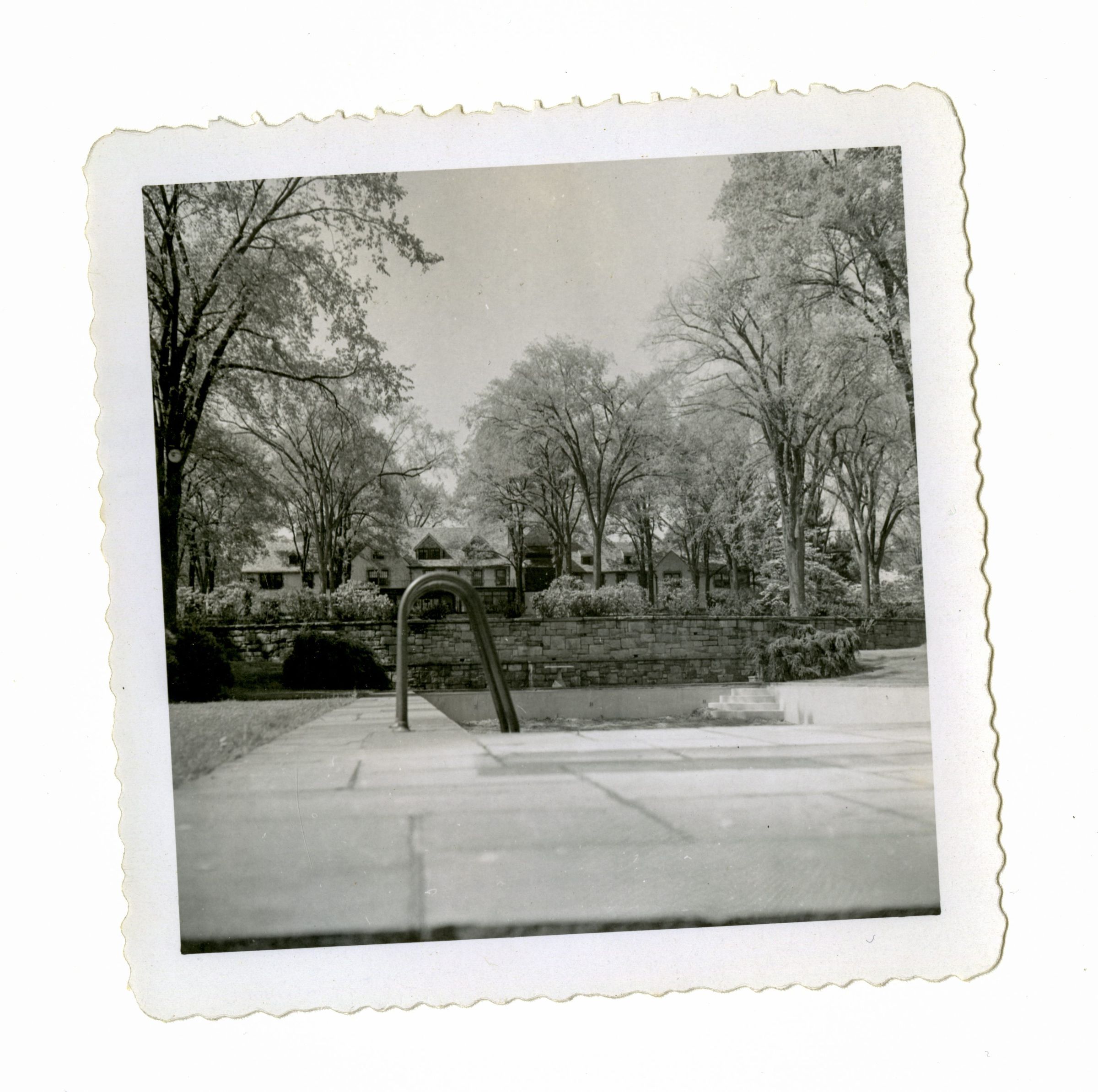 A pool ladder and pool with a large house in the background and flowering trees all over the property.Collection