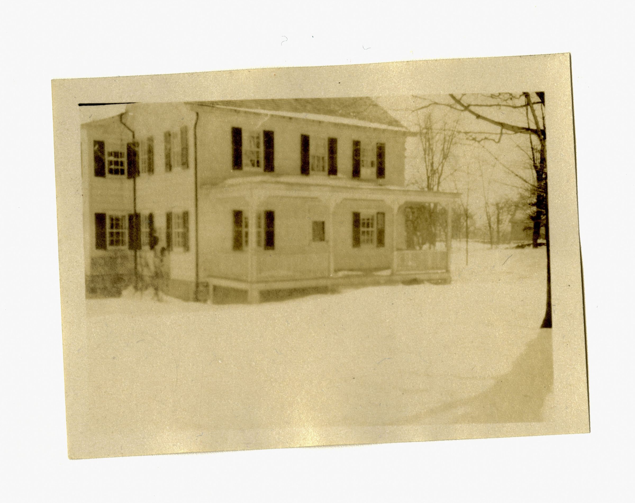 A two story house and its porch in the snow.
