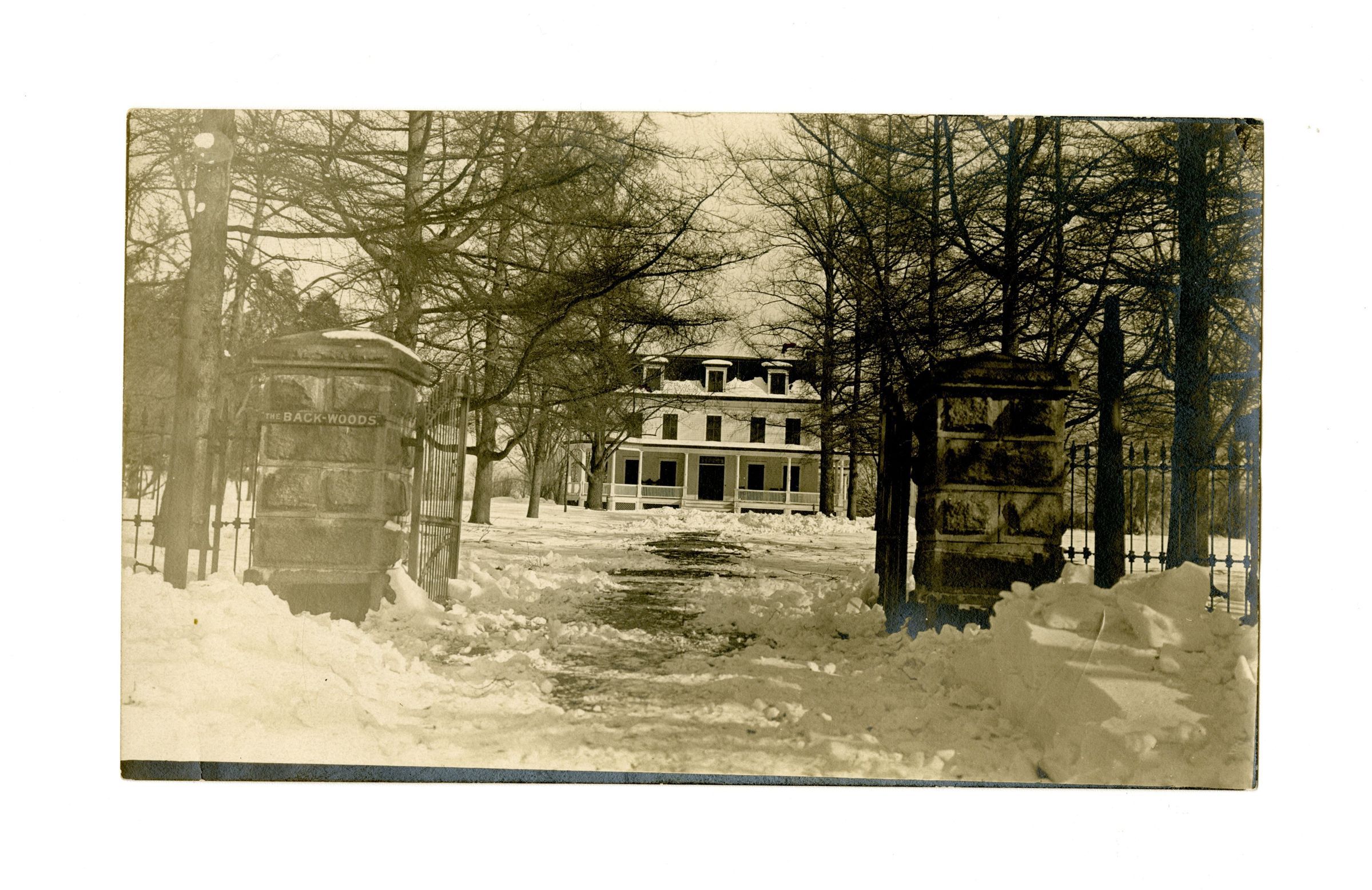A view from the entrance to the driveway of a three story house with a full length porch and dormers.Collection