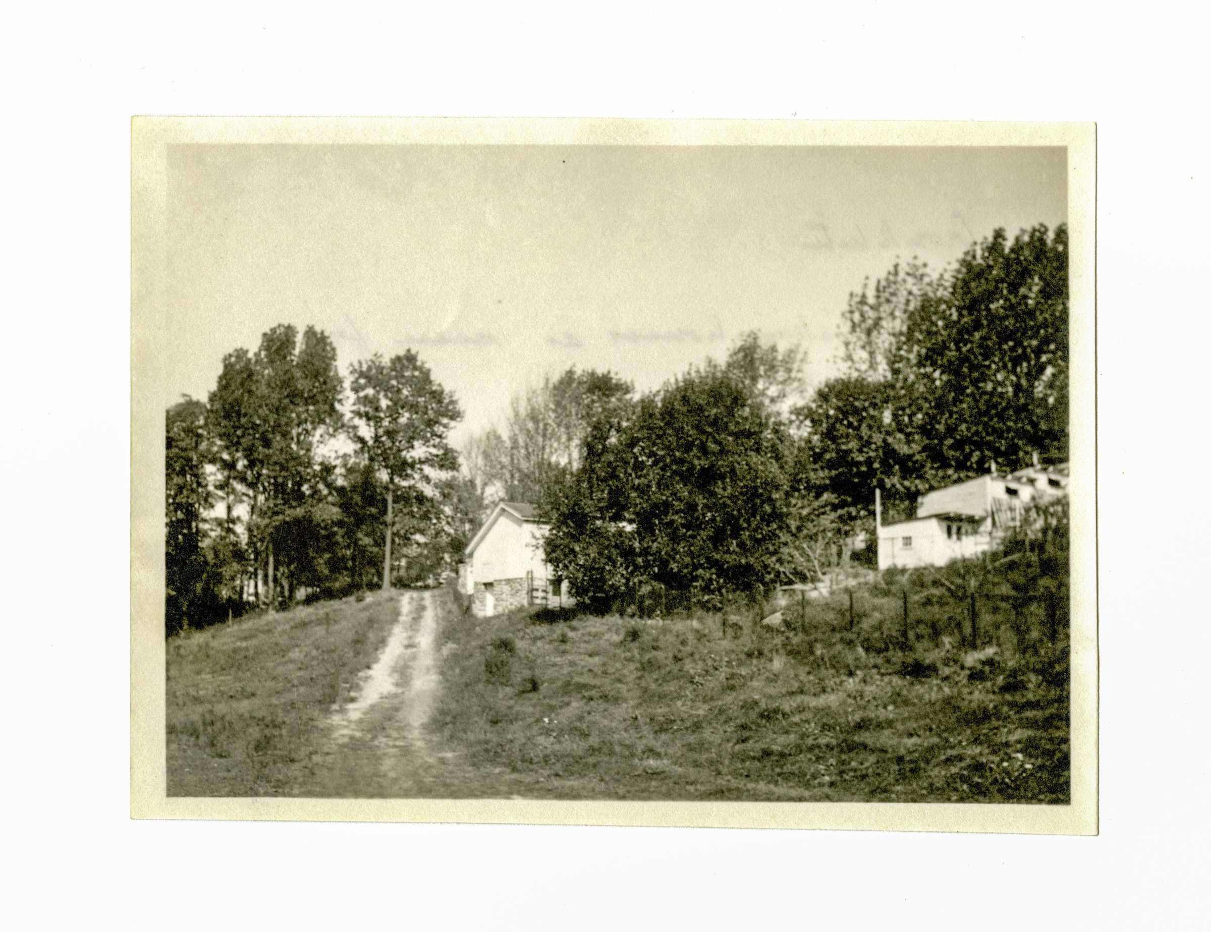 Outbuildings on the property with an unpaved road leading through the field by the buildings.Collection