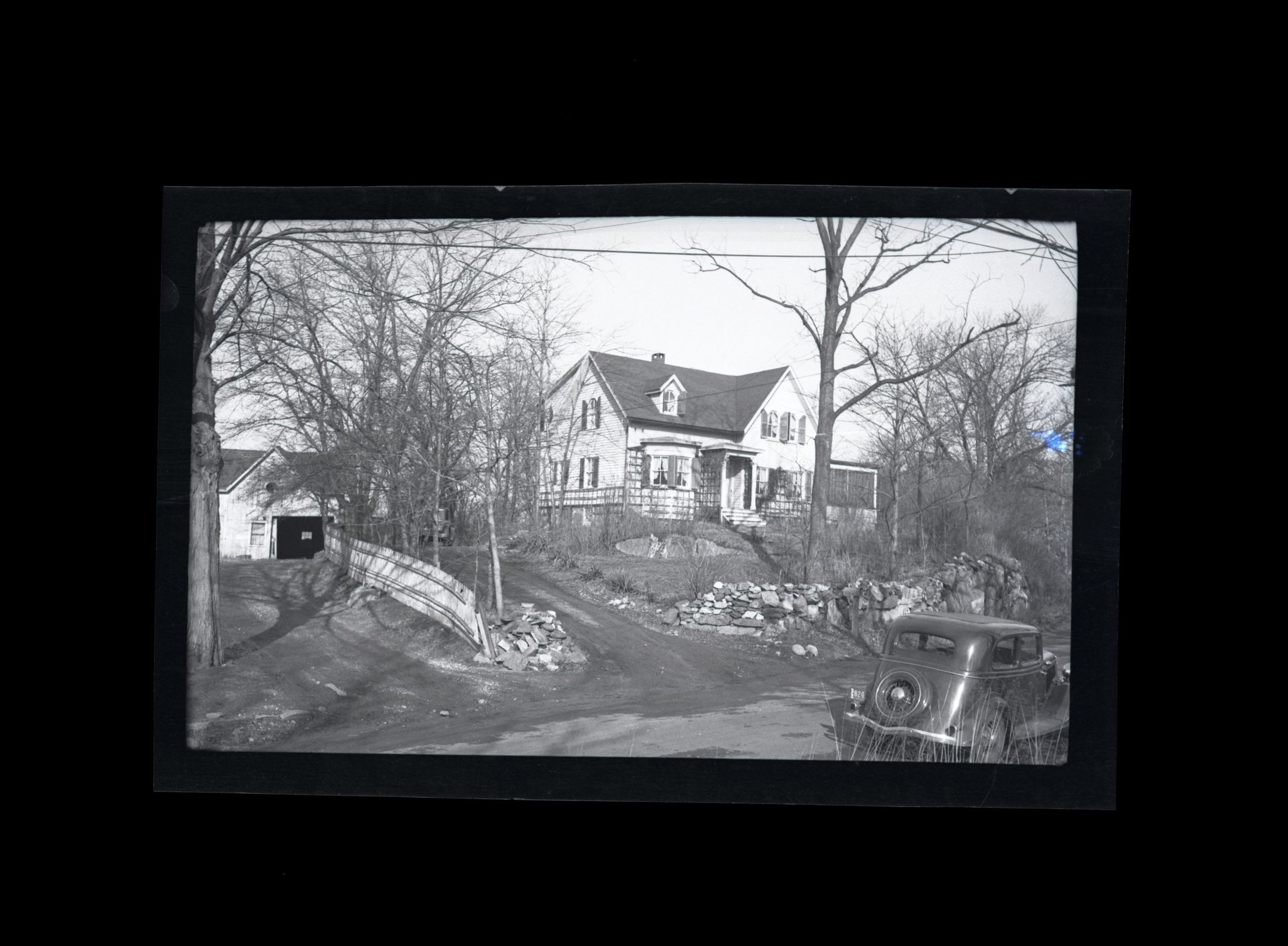 A two story house and its front lawn as viewed from the street. A car is parked in the bottom right corner of the image.Collection