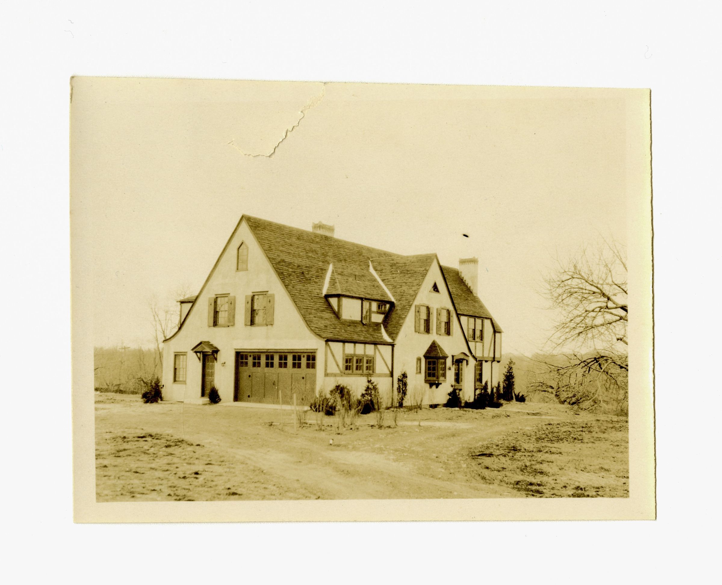A three story house with a two door garage.