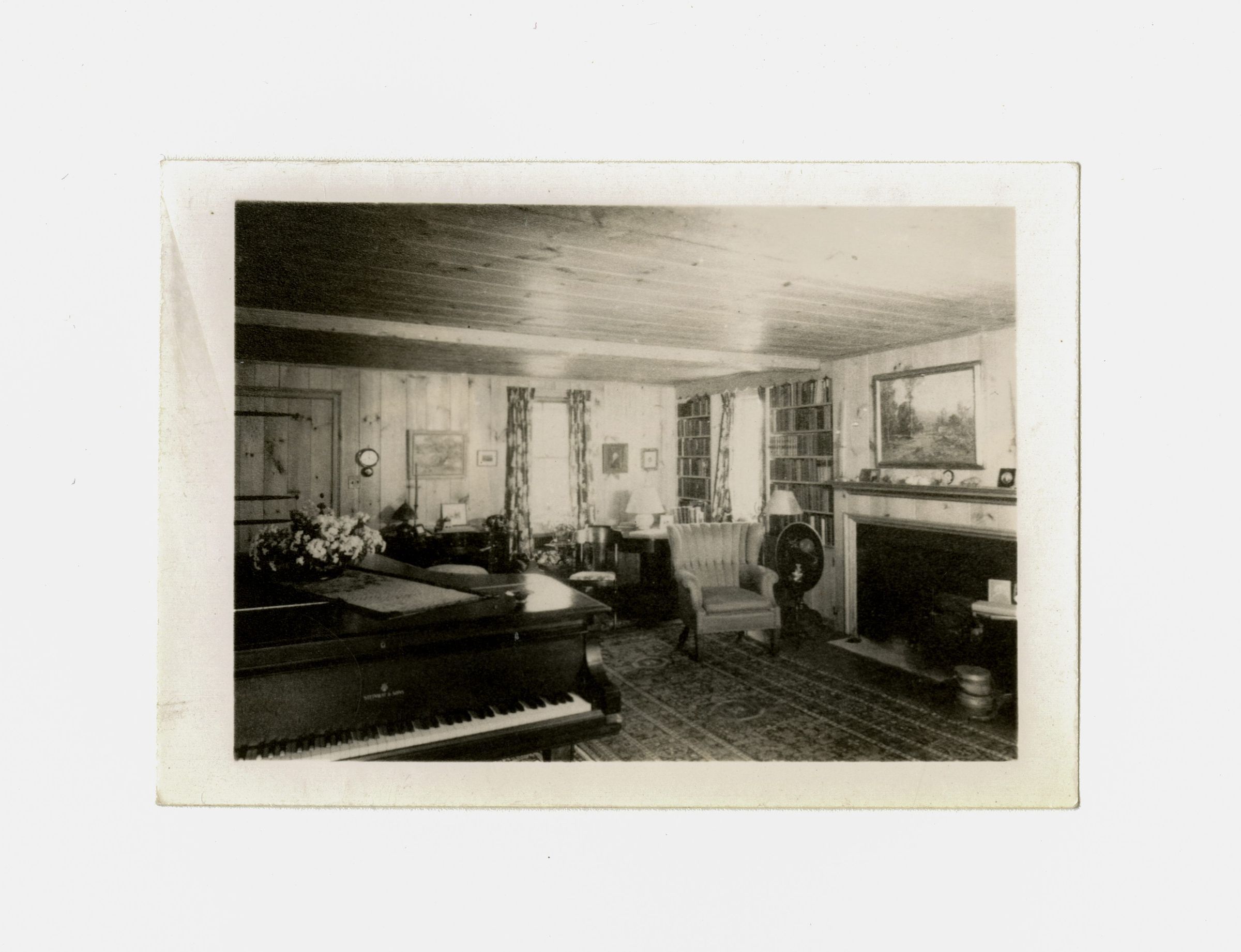 The living room of the home with a Steinway & Sons piano and fireplace visible.Collection