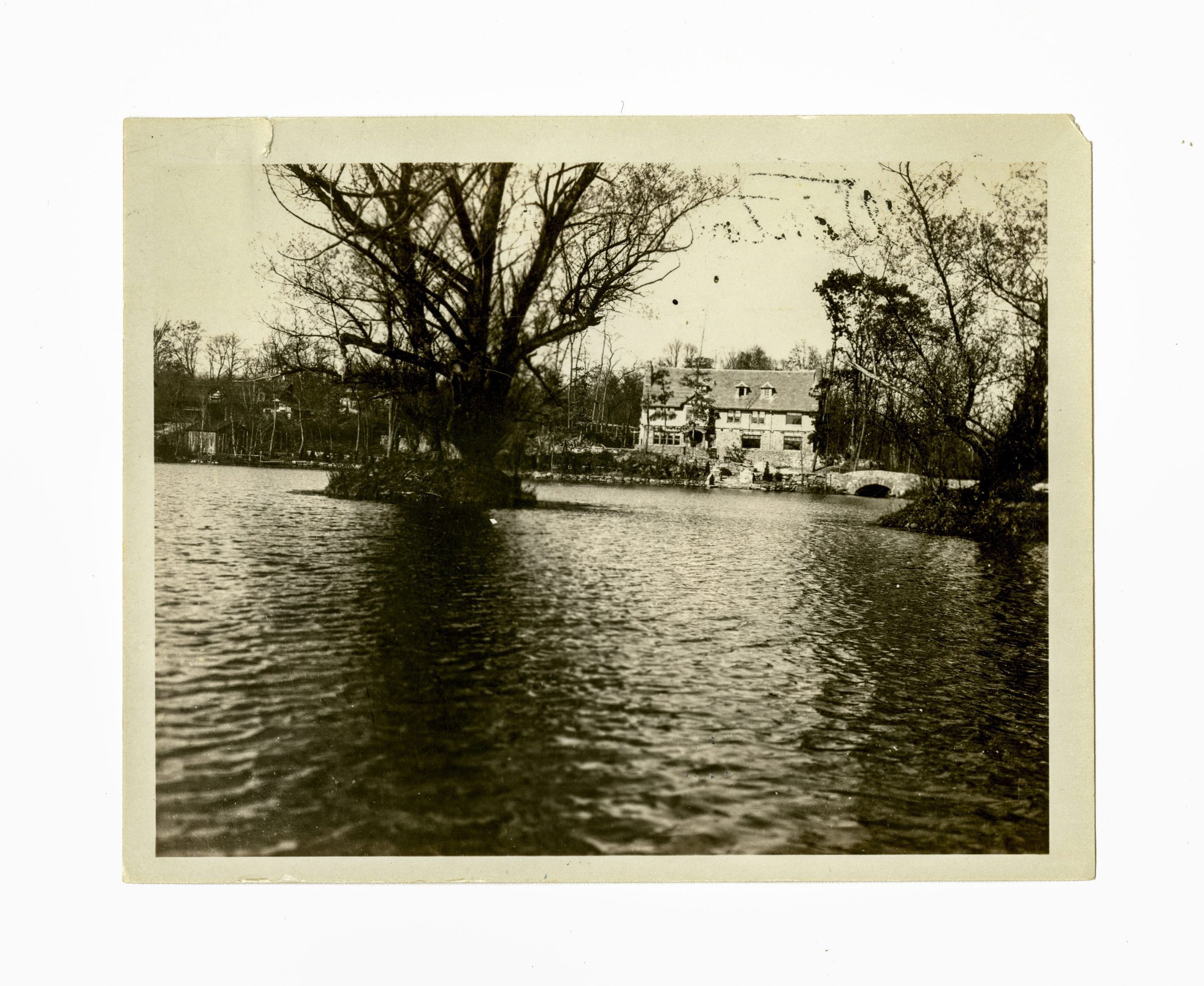 A view looking over a pond towards a three story home. A stone bridge leads over the pond towards the house. Two small islands with trees on them are in the foreground of the image.Collection