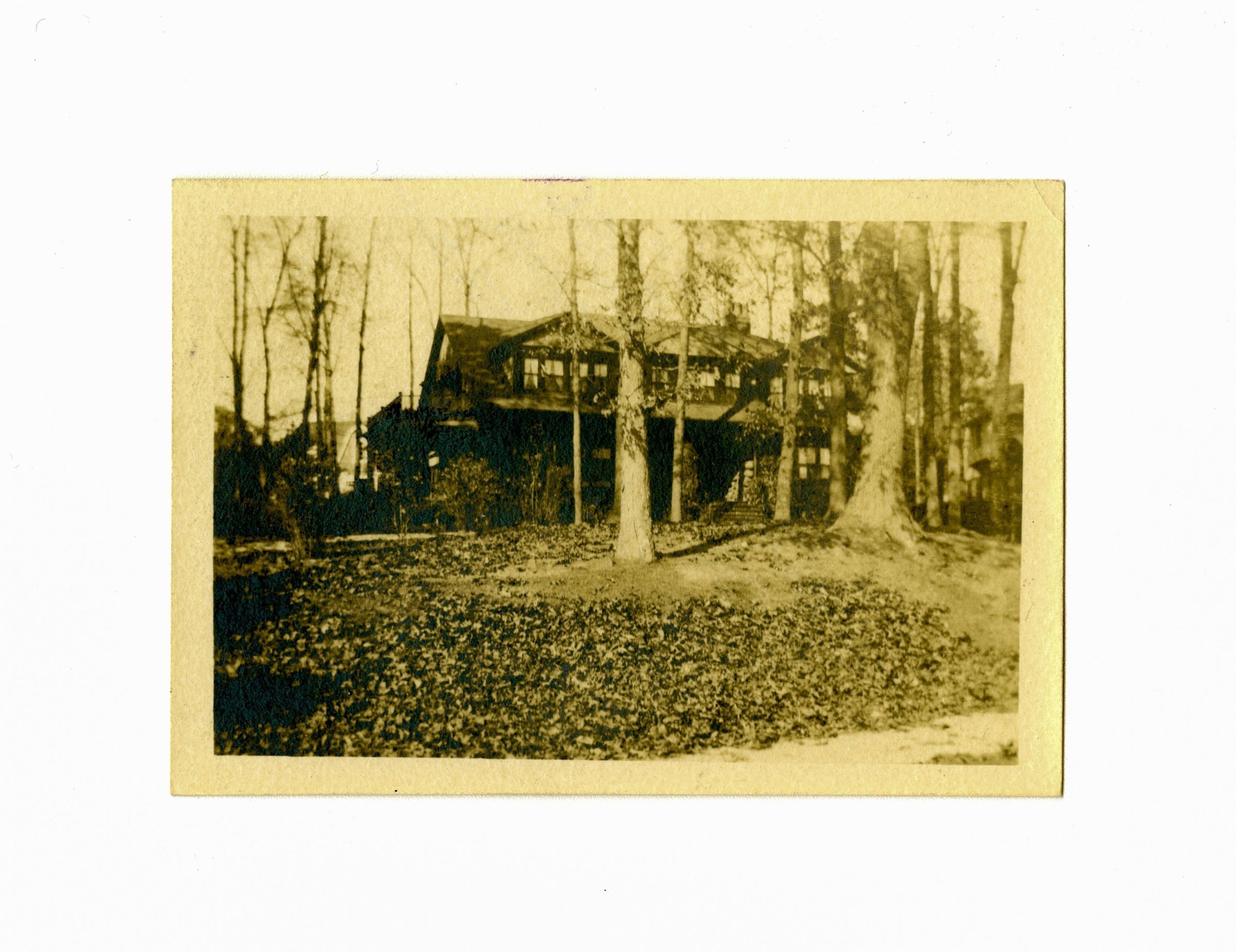 The back of a two story home with a number of trees around it.
