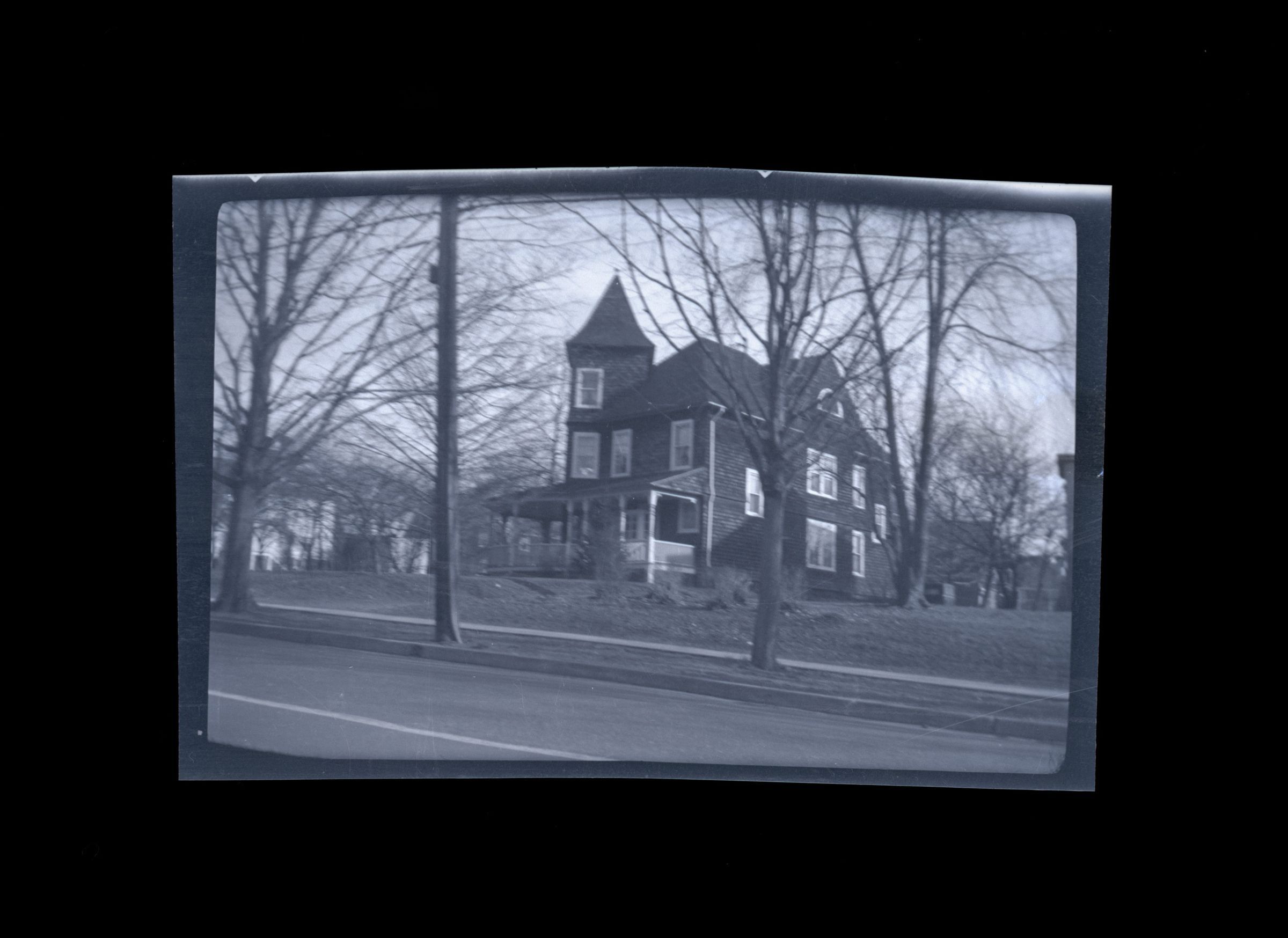 A three story shingle house with a square tower and its lawn viewed from the street.Collection