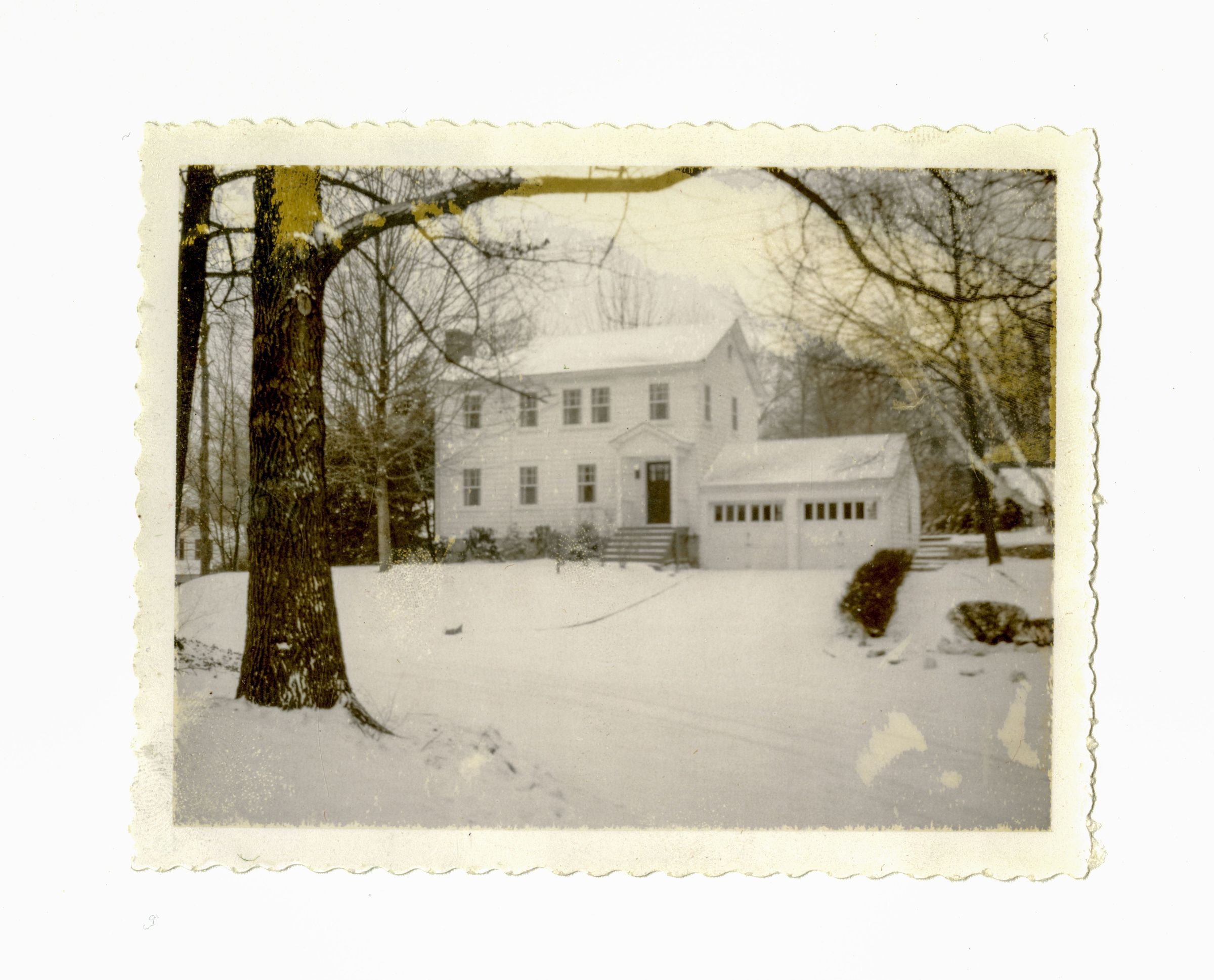 A two story house with a two door garage in the snow.