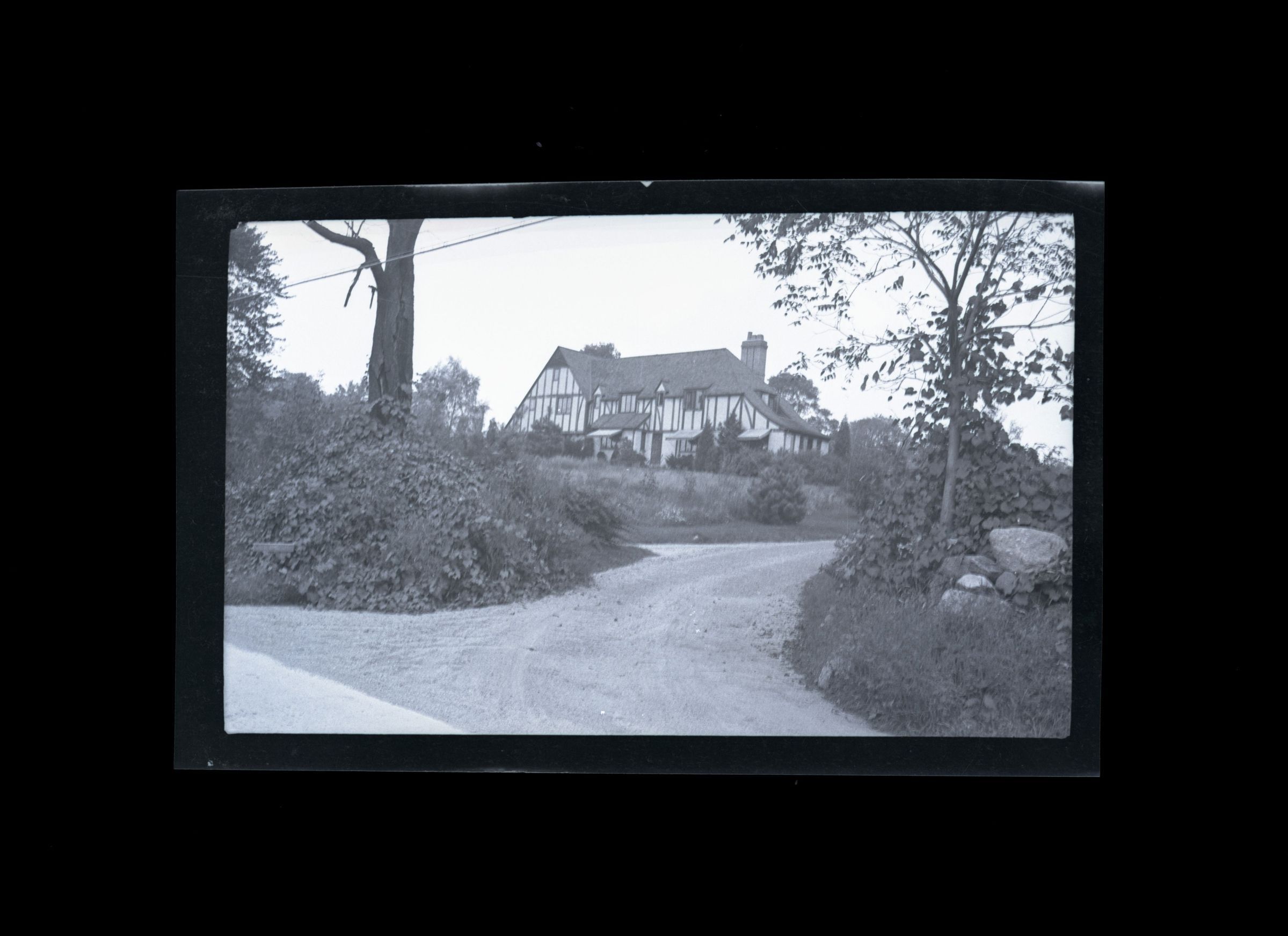 A view of an English-style home as seen from the entrance to the driveway.Collection