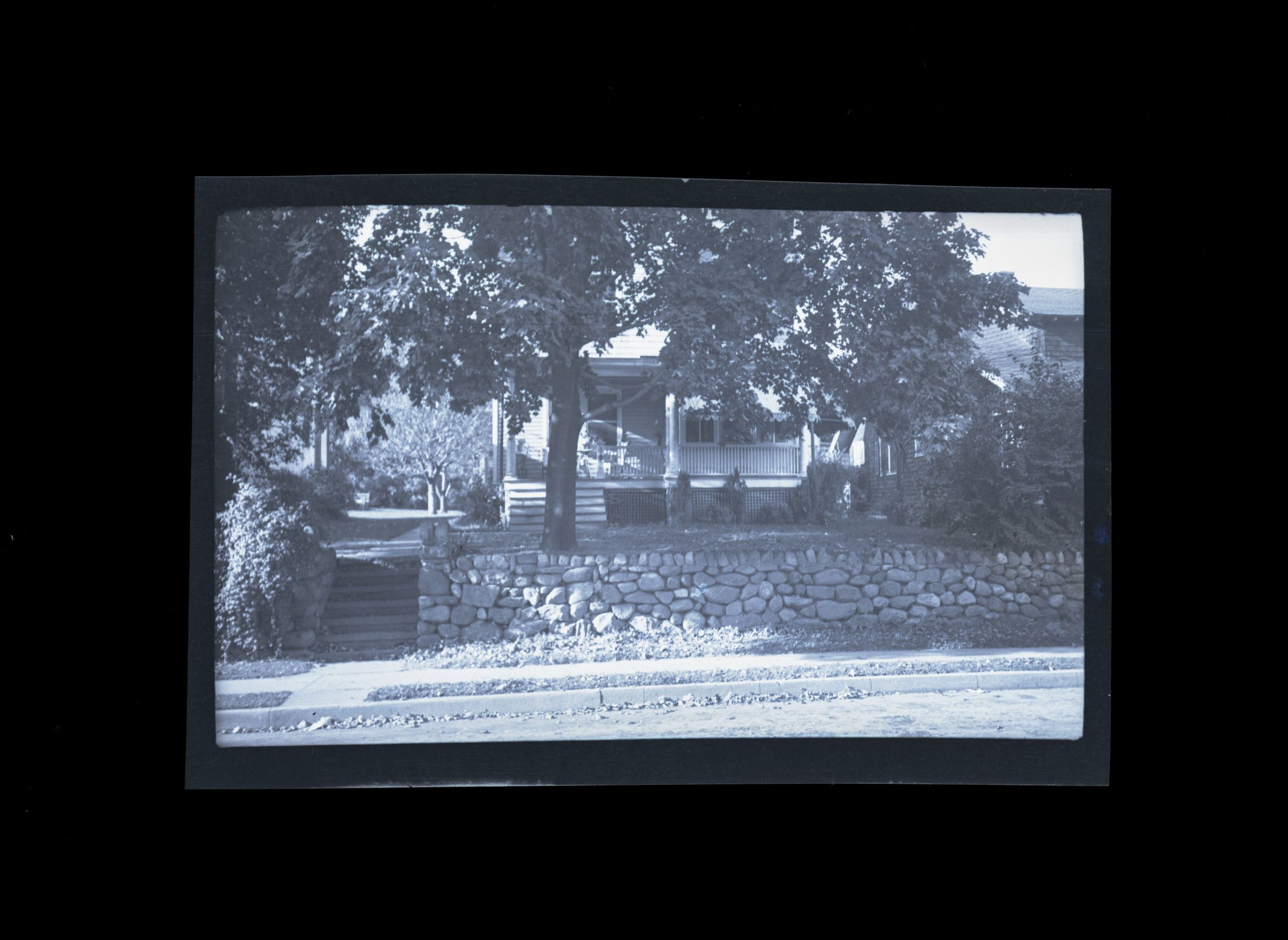 A view of a home with a porch and a stone wall viewed from the street.