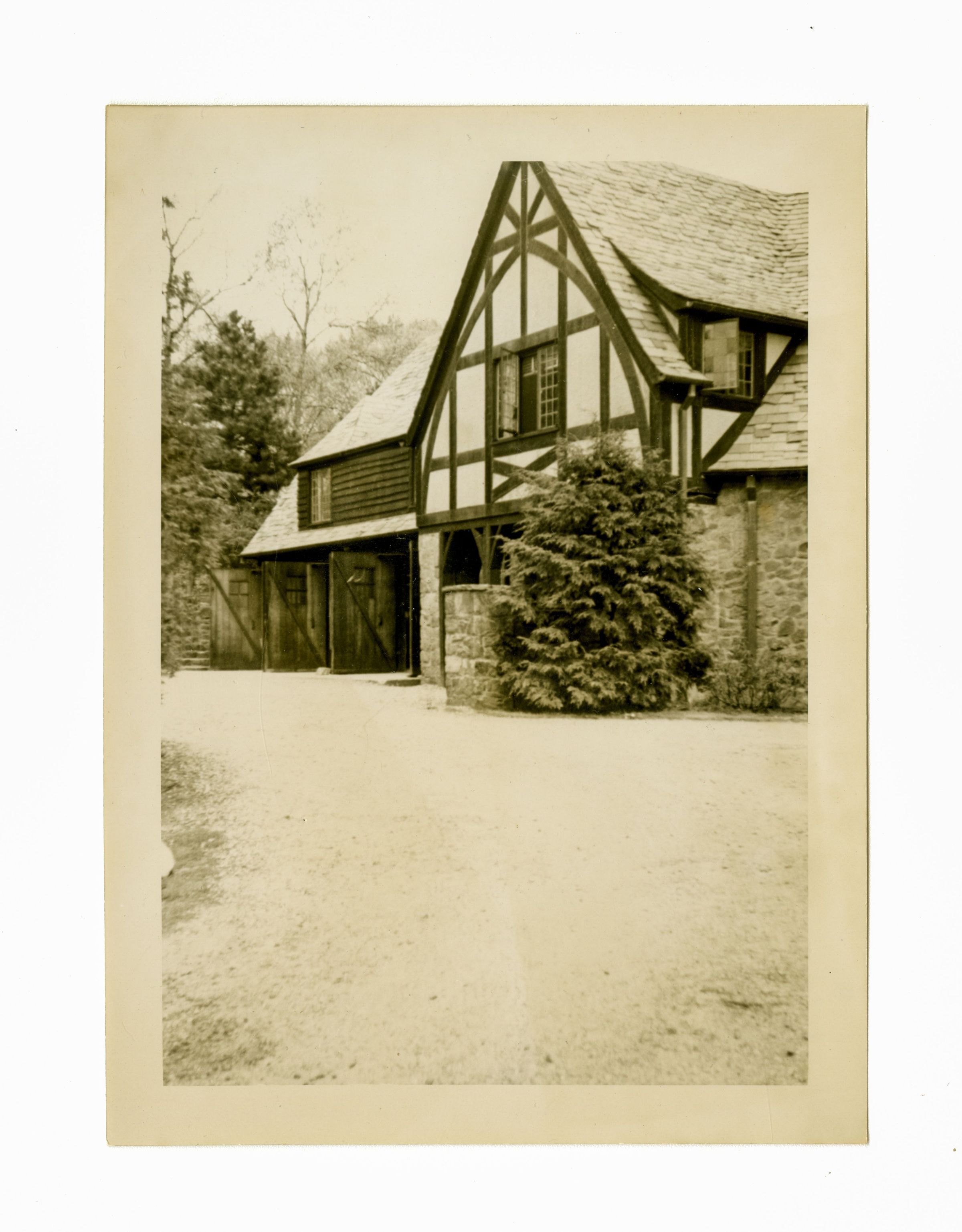A view of the garages of a stone and beam-and-plaster house.