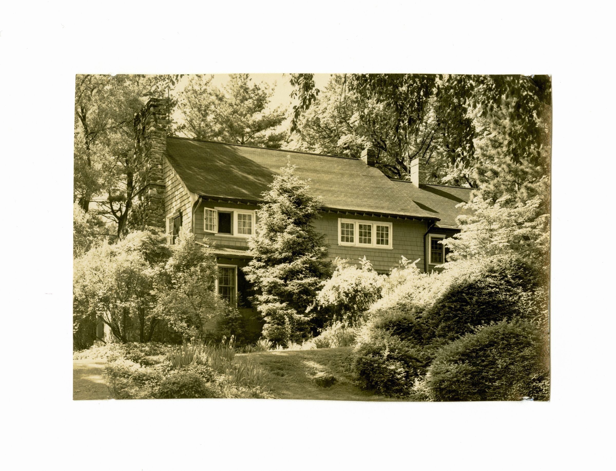 A two story shingle home with a stone chimney and its garden filled with trees and shrubs.Collection