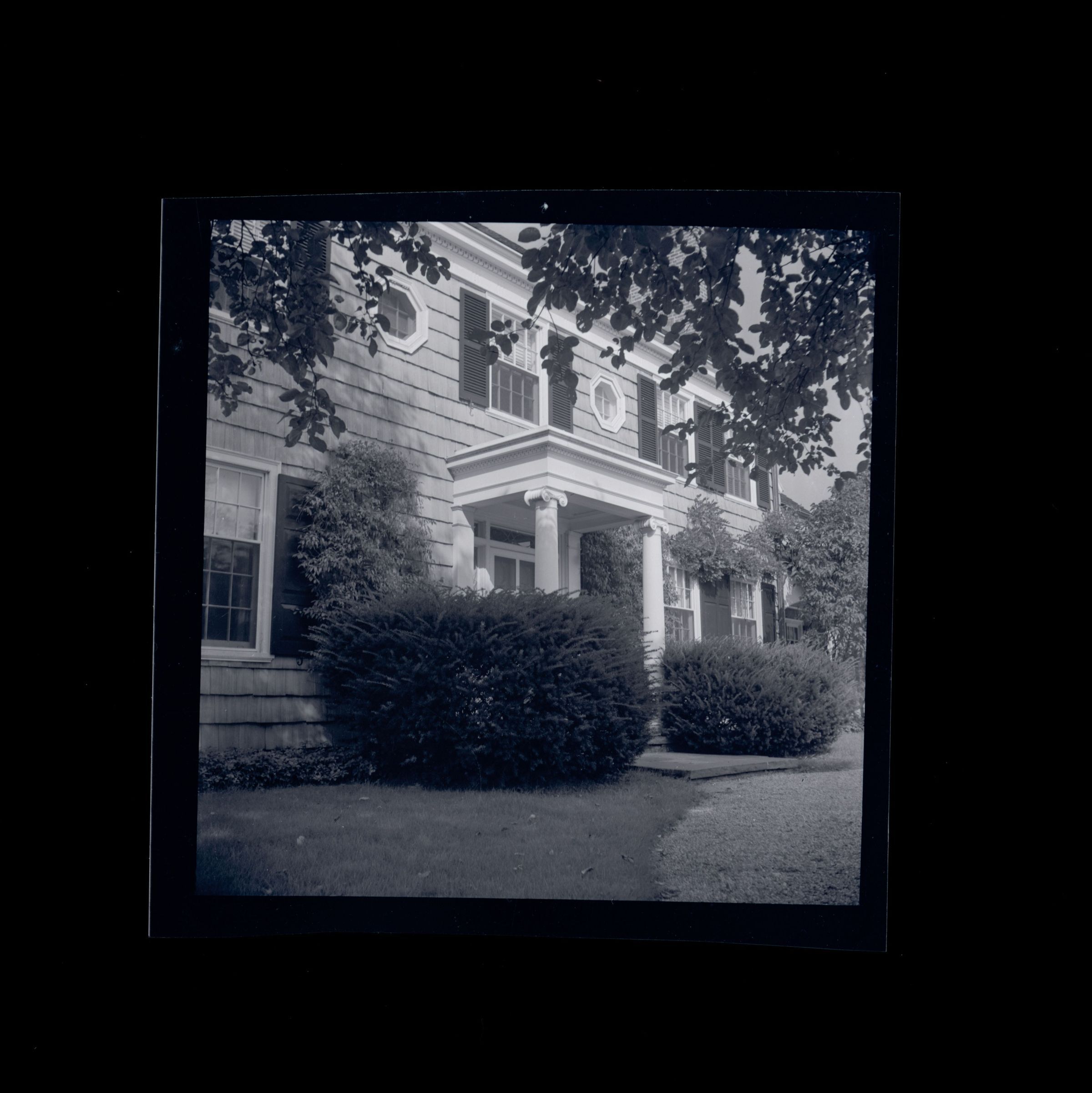 The front door of a two story shingle house. The doorway has a small portico over it.Collection