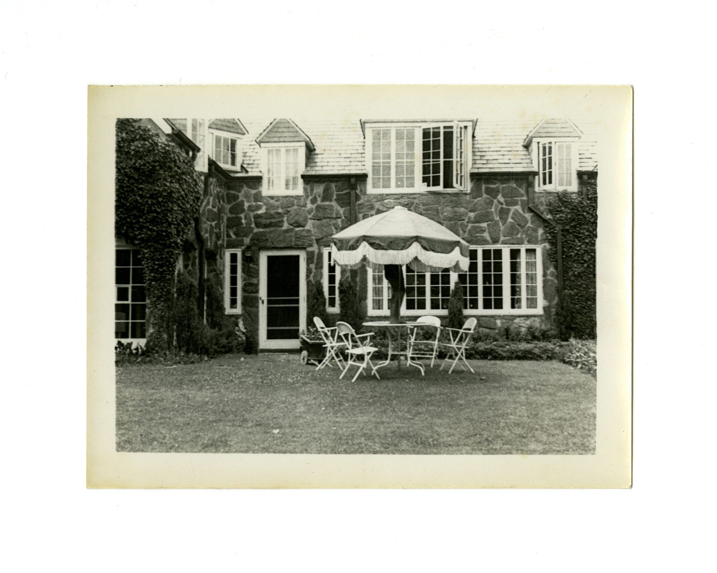 An outdoor table and chairs with an umbrella standing by a side door in the house.Collection