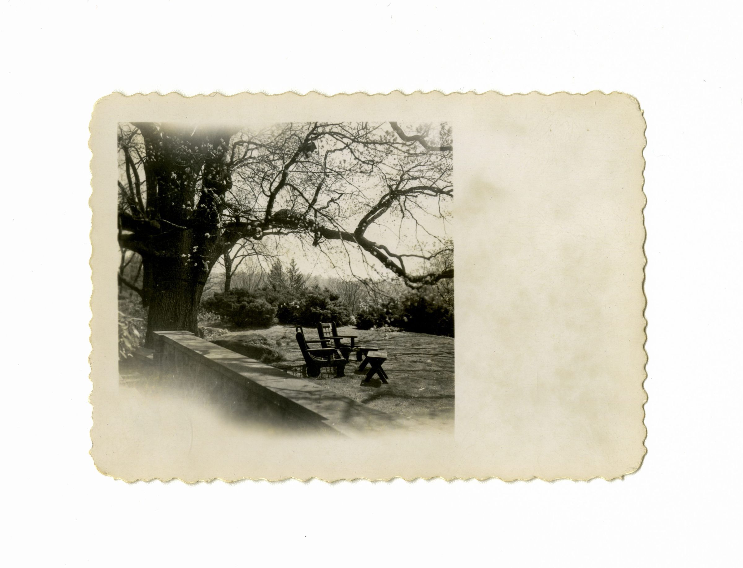A set of chairs on a lawn on the estate sitting under a large flowering tree.Collection