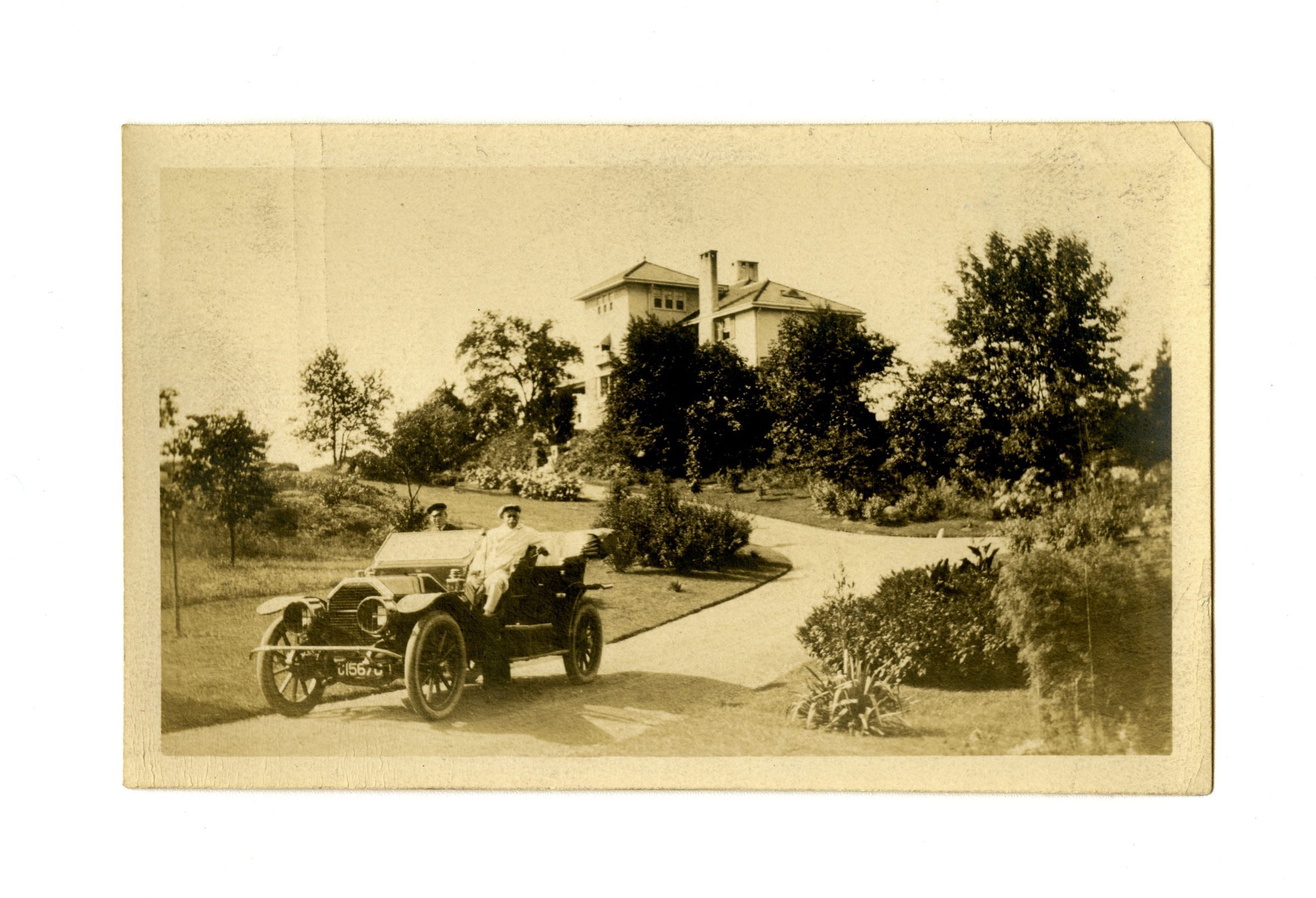 Two men sitting in an open-top car on the driveway of a Mediterranean-style house.Collection