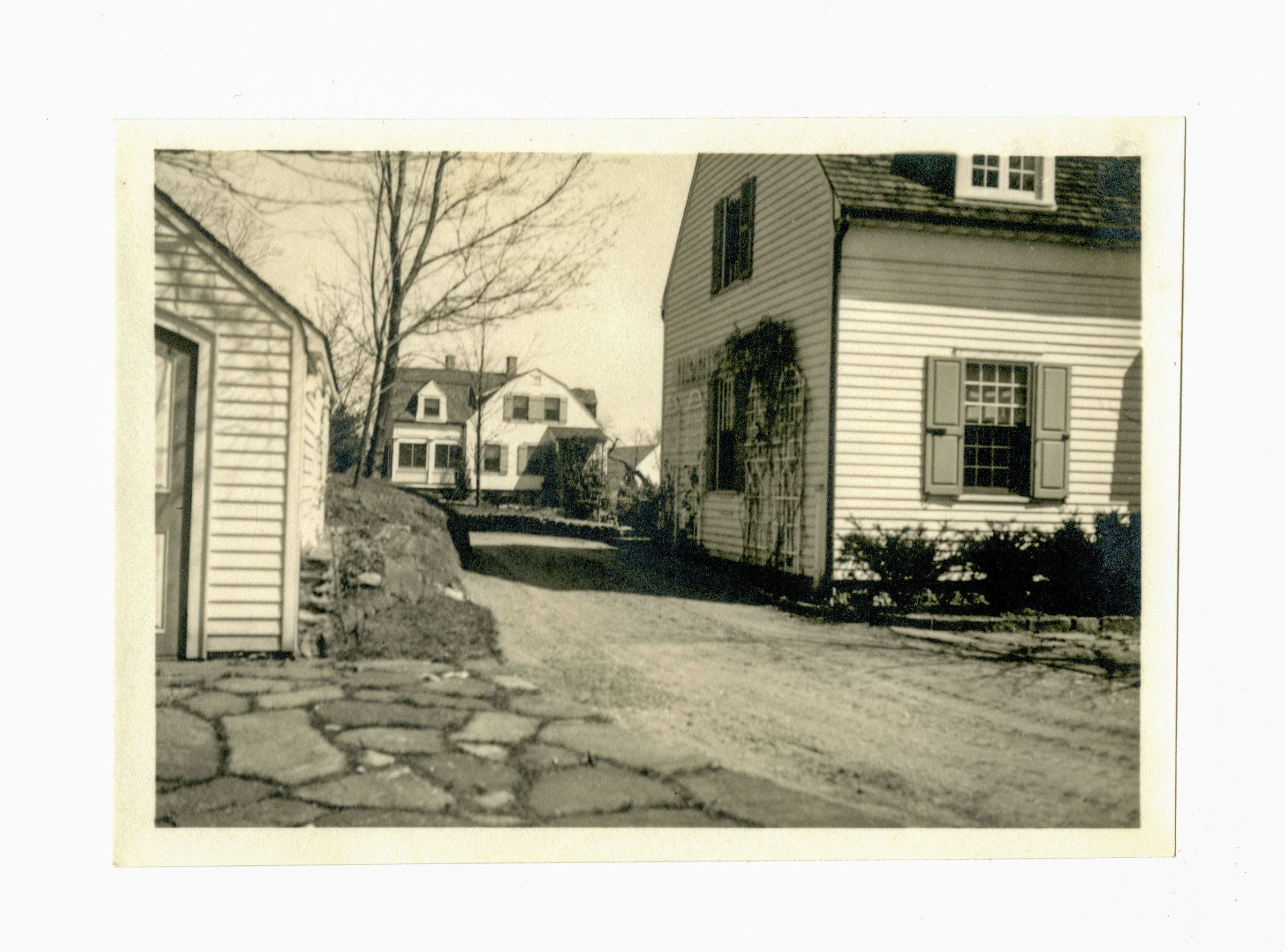 A view from just outside a house and shed/garage on the property, looking down a driveway towards a house with a gambrel-style roof.Collection