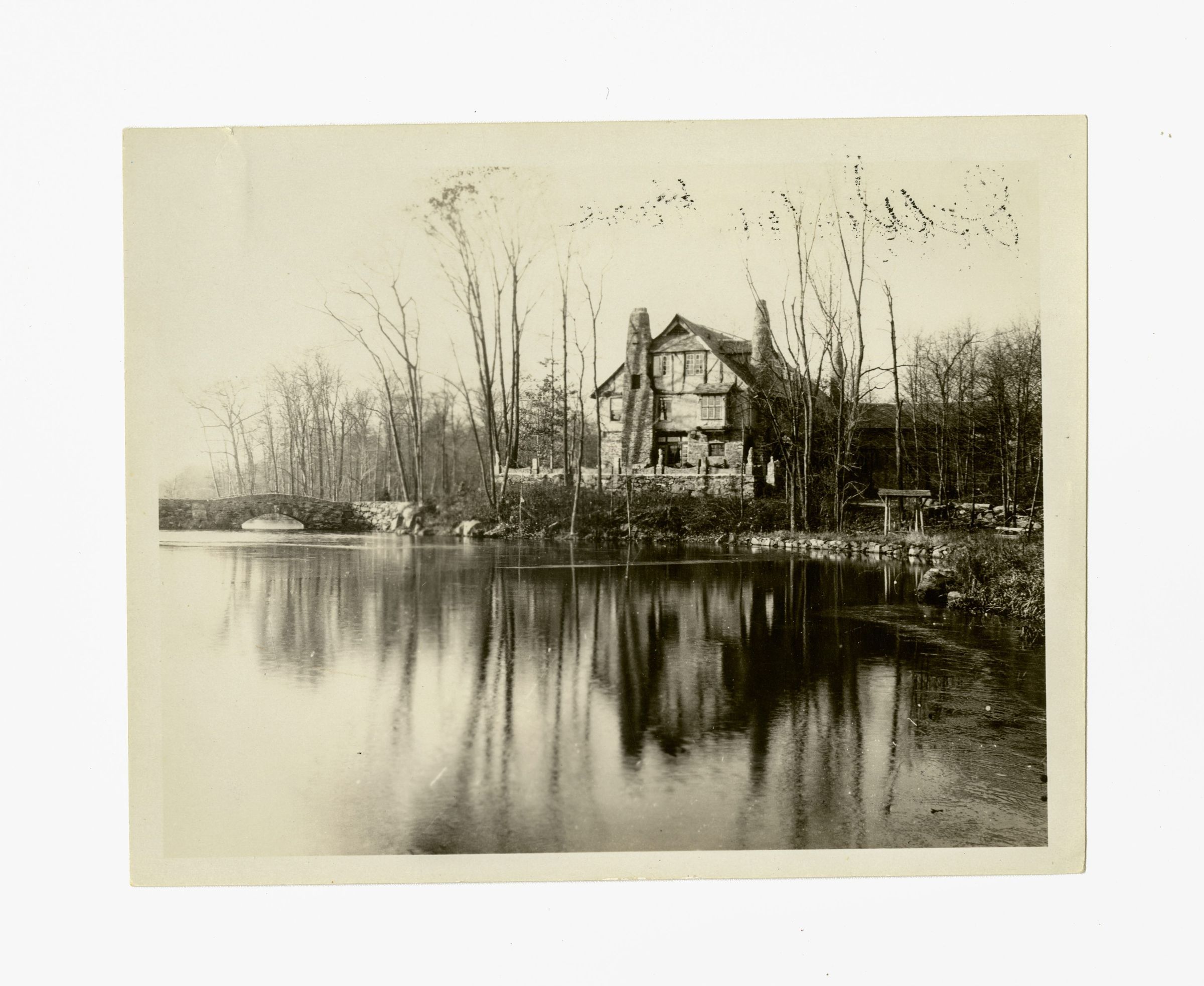 A view looking over a pond towards the side of a home built on the bank of the pond. A stone bridge leads over the pond heading towards the house on the left of the image.Collection