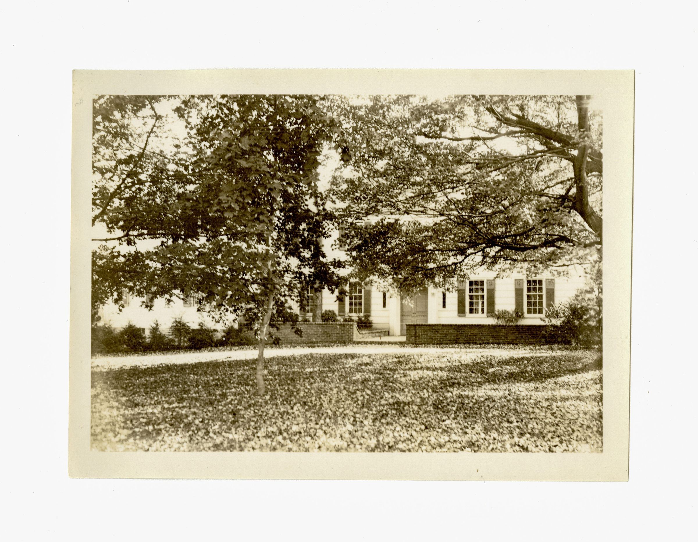 A view of the entrance to a two story house from the front lawn. The house is largely obscured by trees.Collection