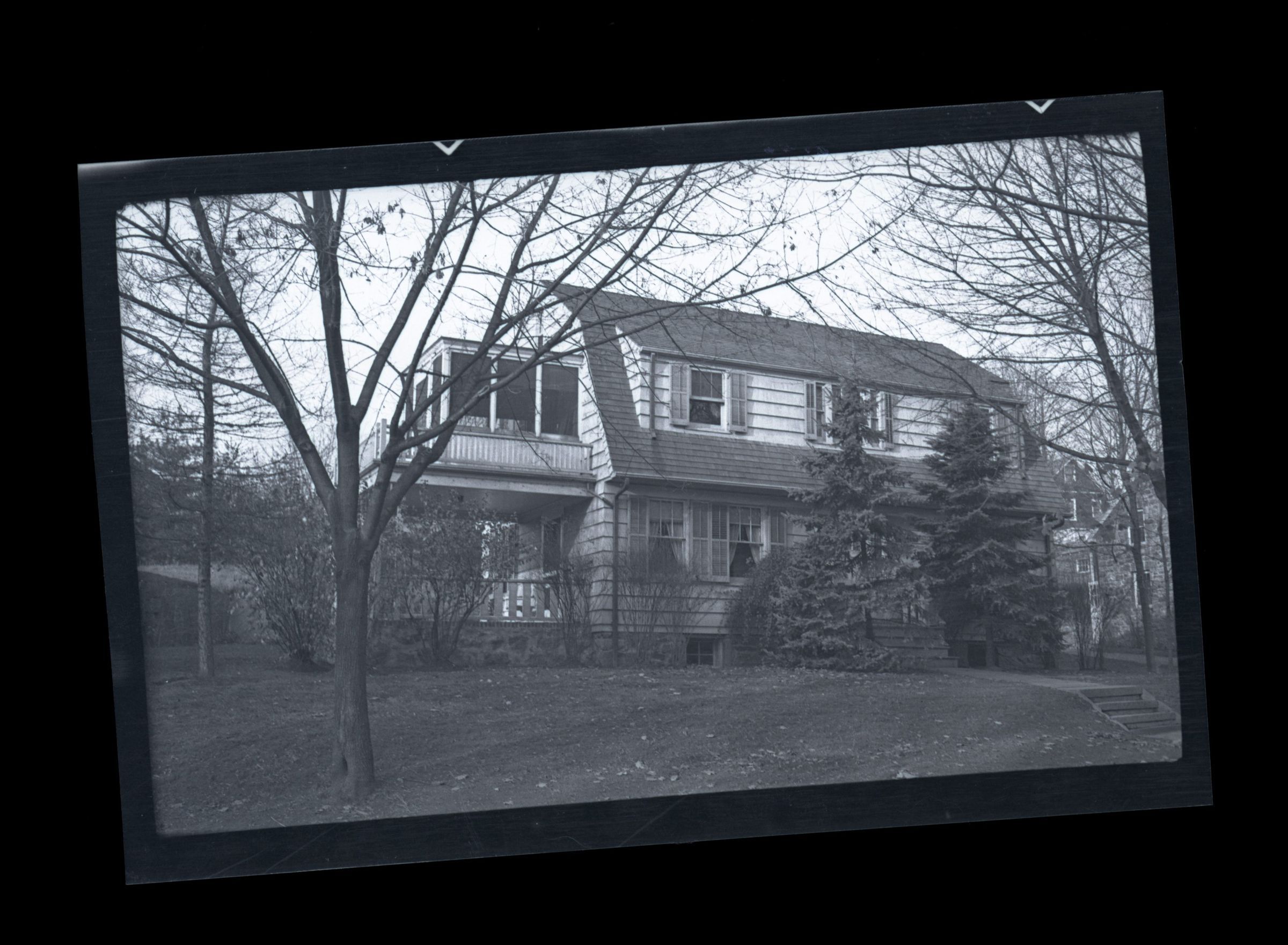 A two story clapboard house with a gambrel-style roof and its front lawn.