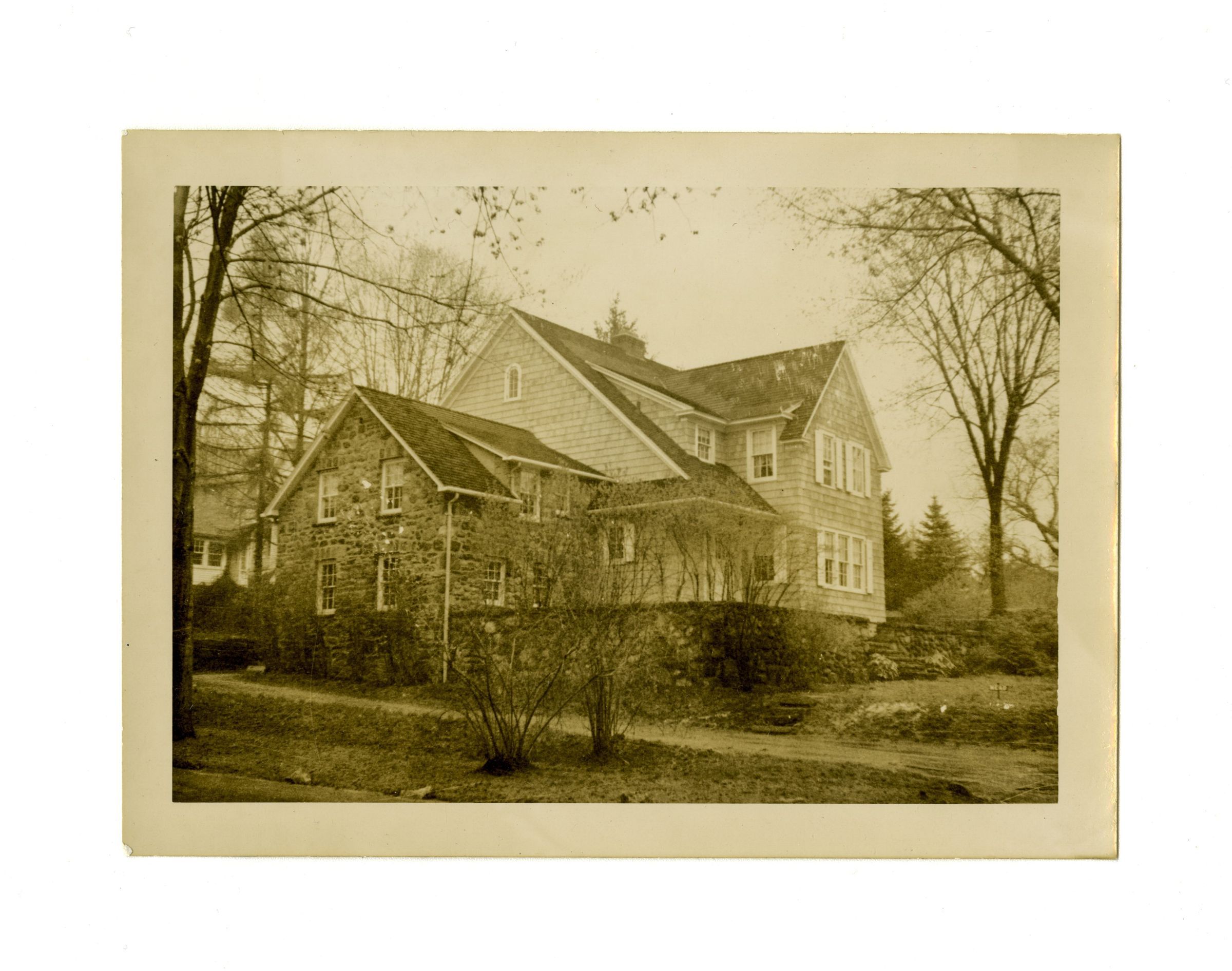 A three story house with shingle walls on the main section of the structure and stone walls on the two-story wing on the left of the structure.Collection