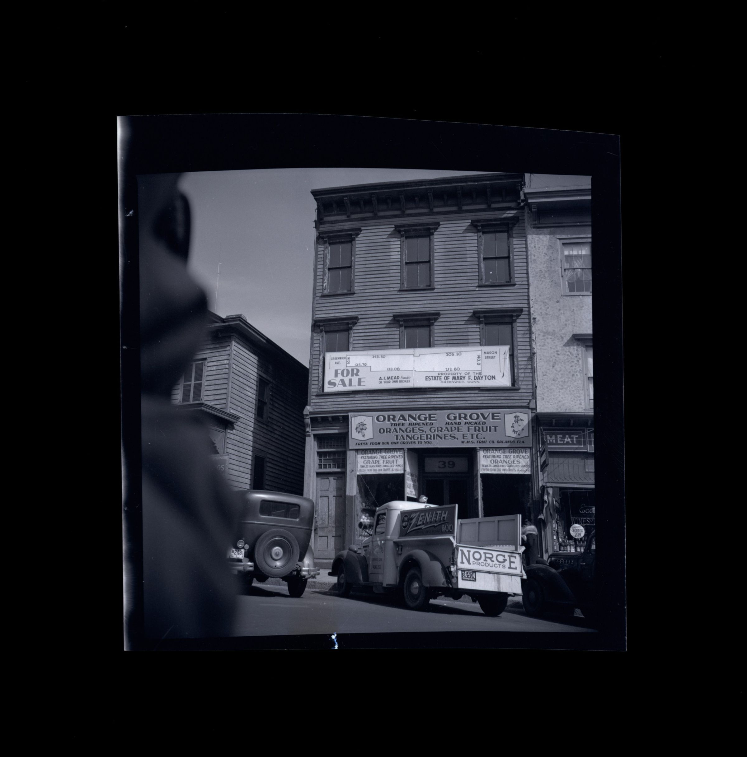 Storefront of the Orange Grove store, a store that sold citrus fruit from Florida. A sign for the sale of the estate of Mary F. Dayton is above the shopfront. A Norge Products truck is in front of the store with an advertisement for Zenith radios.Collection