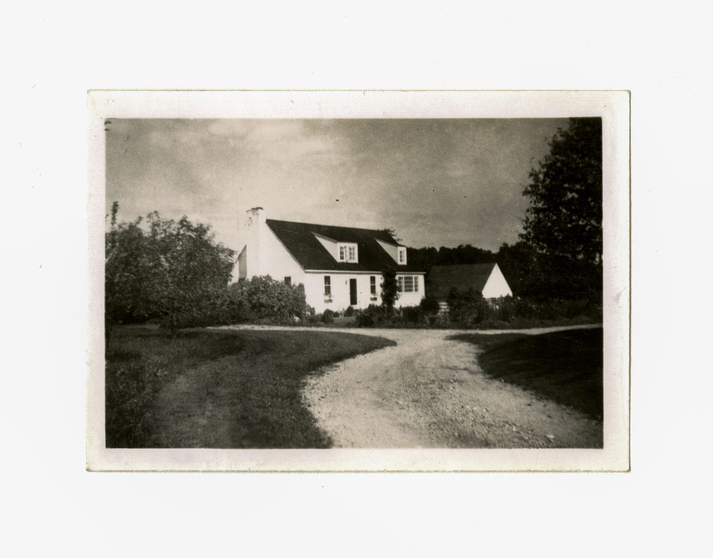 A two story home with two dormers and an outbuilding visible in the background.Collection
