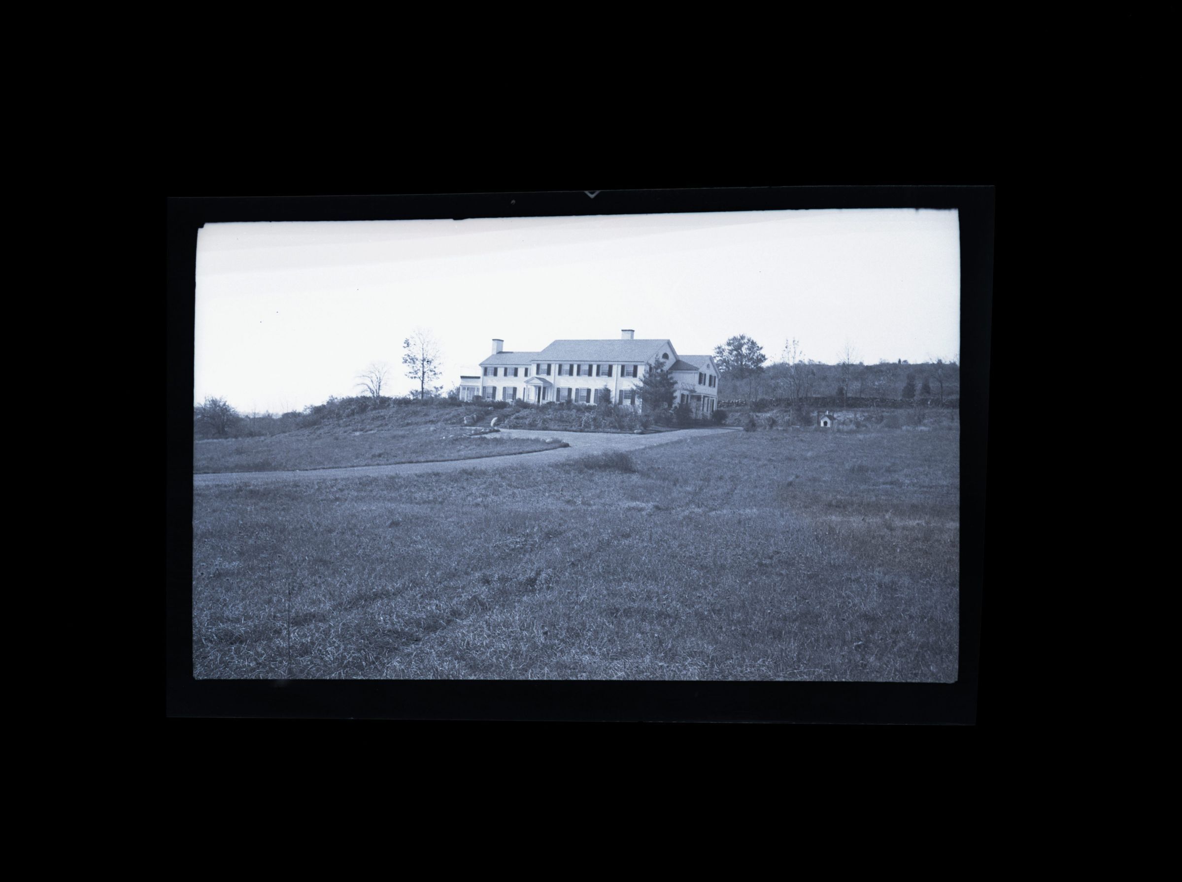 A three story house viewed from its large front lawn, a doghouse can be seen on the right of the image.Collection