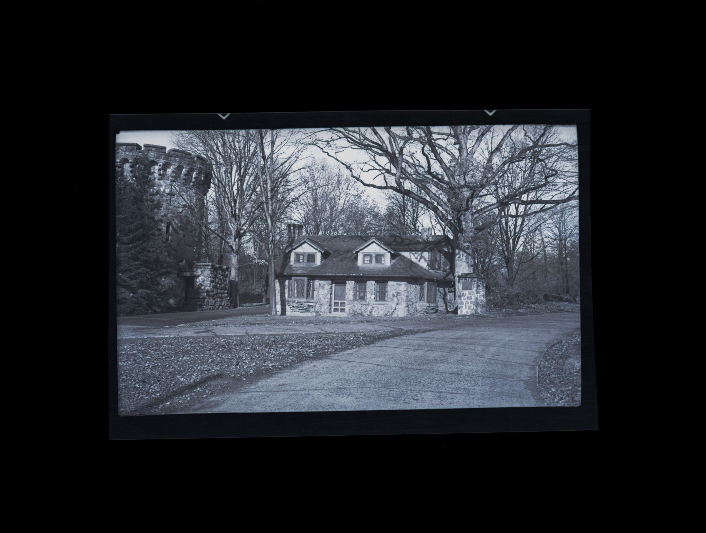 The entrance to Edgewood School, now Eagle Hill School. A small stone cottage on the road with a stone, crenellated tower on the left of the image.Collection
